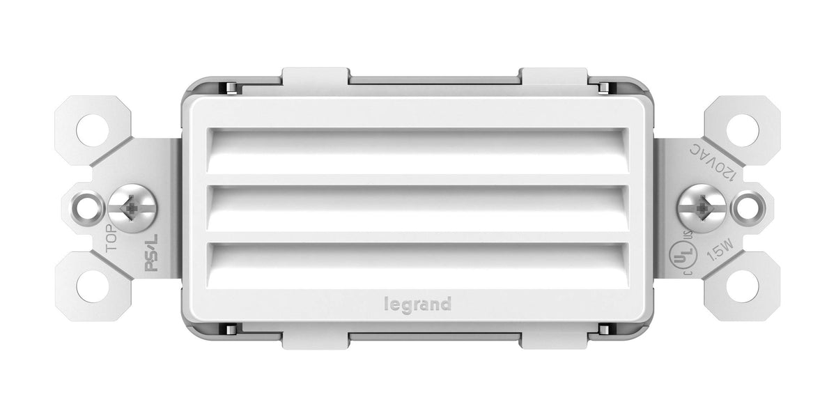 Q: What color options are available for the Legrand Radiant Night Light?A: The Legrand Radiant Night Light is available in a sleek white color, making it a stylish addition to any hallway, kitchen, or nursery.