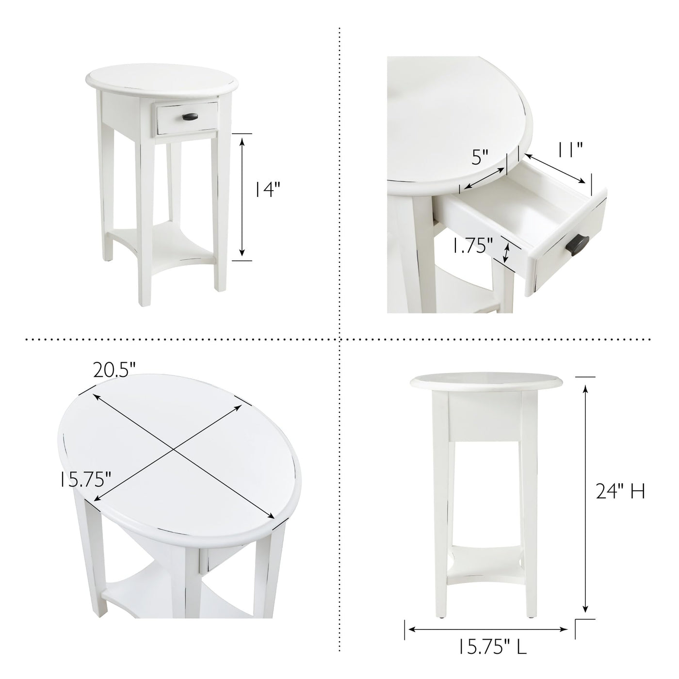 Transform Your Home Into A Haven Of Style And Elegance With The Charming Haven Ridge Oval End Table From Leick Home. This Versatile Living Room End Table Is Meticulously Designed To Complement A Wide Range Of Popular Color Schemes And Styles, Making It An Ideal Choice For Any Room In Your Home. Crafted With Utmost Care, This Side Table Achieves A Harmonious Blend Of Compact Design And Generous Storage Capacity. The Distressed Farmhouse White Finish Lends A Charming Rustic Appeal, While The Sleek Matte Black Hardware Adds A Modern Twist. The Combination Of These Elements Creates A Timeless And Eye-Catching Circular Side Table That Seamlessly Blends With Your Existing Furniture. Durability Is A Top Priority, And The Haven Ridge End Table Doesn'T Disappoint. Constructed With High-Quality North American Solid Hardwood, This Table Is Built To Last For Years To Come. Stay Organized Effortlessly With The Inclusion Of A Dovetailed Solid Wood Drawer Box, Providing A Convenient Storage Solution For Small Items Such As Remote Controls, Coasters, Or Reading Glasses. The Bottom Display Shelf Offers Easy-To-Reach Functionality, Allowing You To Showcase Your Favorite Decor Pieces Or Store Additional Essentials Within Arm'S Reach. Easy To Assemble With Pre-Assembled Drawer. Designed And Manufactured By Leick Home, The Trusted Source For Quality Home Furnishings For Every Taste And Budget.