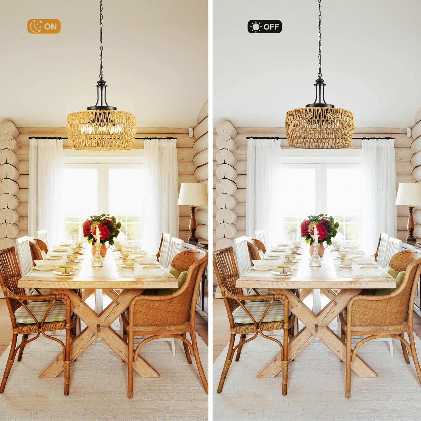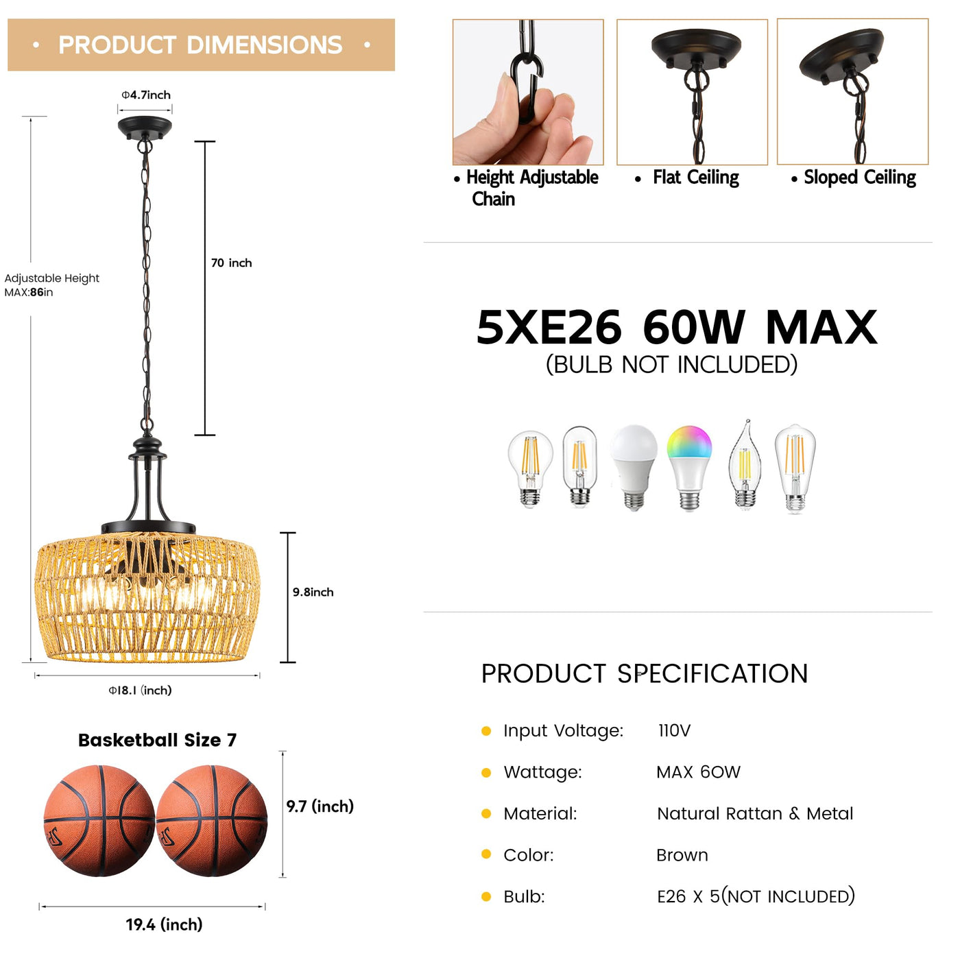 5-Light Boho Rattan Chandelier: Brighten Up Your Dining Room With This Beautiful Farmhouse Chandelier, Made From Natural Rattan That Combines Rustic Style With A Modern Touch.