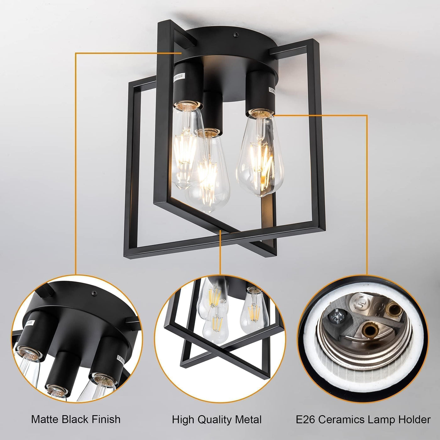 Leip 3-Light Ceiling Light Fixture, Semi-Flush Mount Light With Contemporary Geometric Metal Cage, Farmhouse Industrial Lighting For Kitchen Living Room Bedroom Hallway Foyer, E26 Black