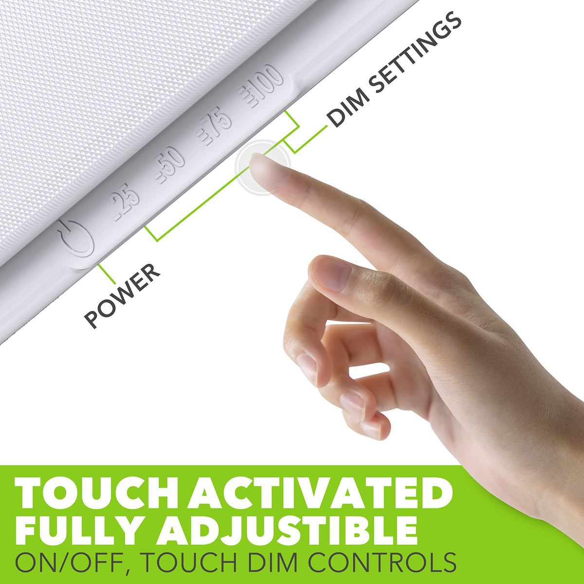Built-in touch to dim switch allows for adjustable brightness: Off, 25%, 50%, 75%, and 100%.