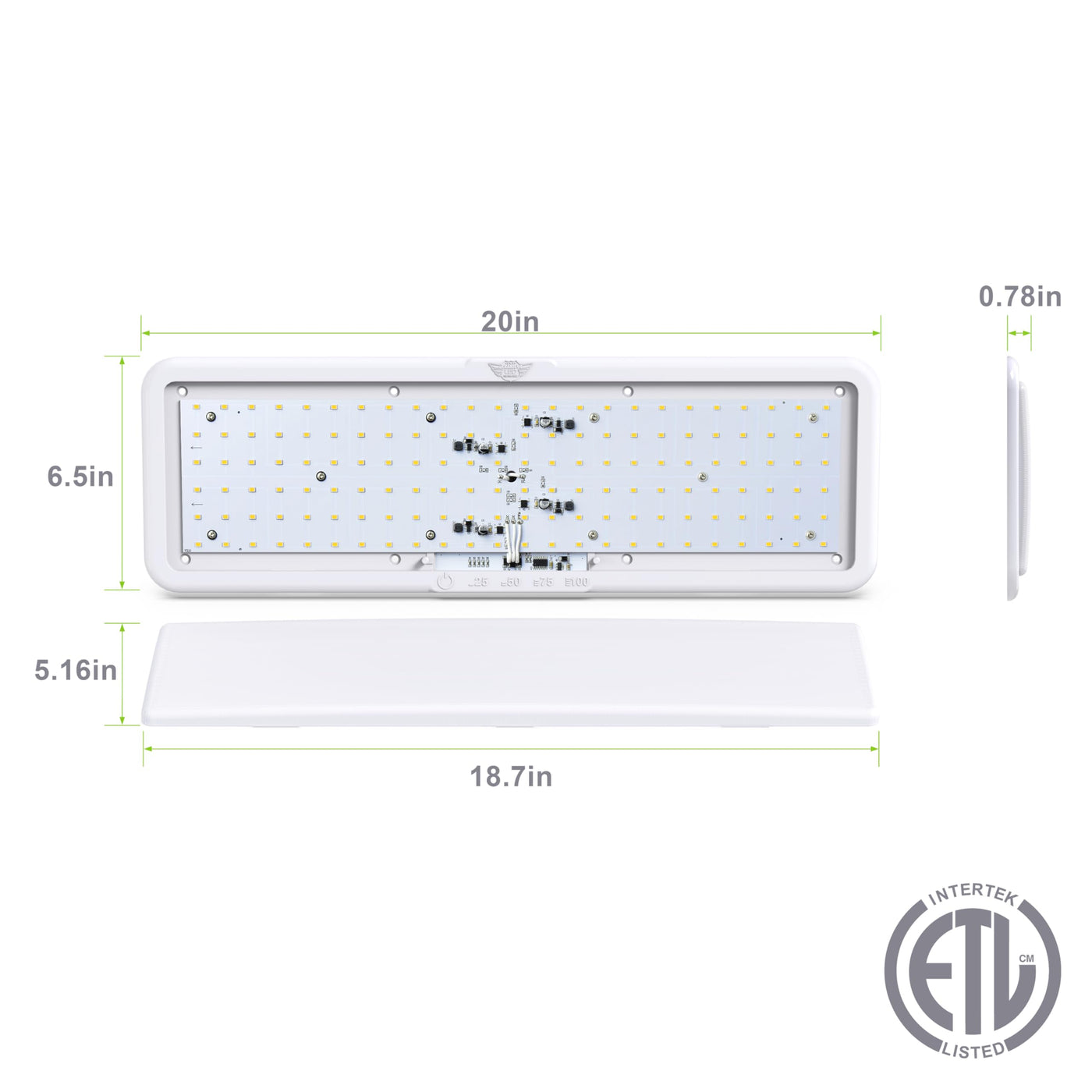 Q: What are the dimensions of the Leisure LED RV Ceiling Light Fixture?A: The Leisure LED RV Ceiling Light Fixture measures twenty inches by six and a half inches.