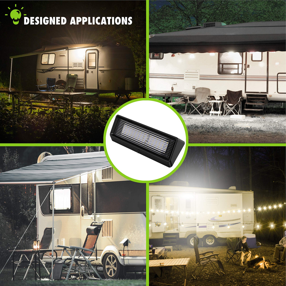 New LED Rectangle Porch Light With Switch 650 LUMEN Cool White Description: LED Rectangle Porch Light Fixture 650 Lumens Made with Environment-friendly technology and materials. Wide Voltage Range : 11-18 volts Applications include 12 Volts DC recreational vehicles. RV fluctuations can damage a regular LED. This LED is designed to withstand a wide operating voltage range 10-30 Volt. Beam pattern : 120 degrees Color Temperature : 6000-6500K Cool White 60 High power 2835 LEDs. 6.2 Power Watts 60,000 hour life expectancy. Last many times longer than standard light bulb