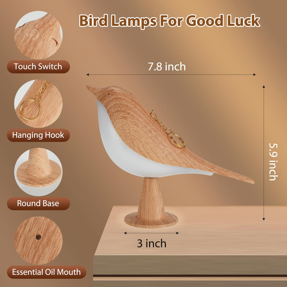 The Bird Table Lamp Will Accompanys Kids To Sleep And Keep The Nightmares Away. 3 Levels Of Brightness And Touch Dimming Bird Lamps 1.Add A Touch Of Whimsy To Your Space With Our Small Bird-Shaped Bedside Table Lamps. Its Lovely Design In Natural Wood Color Complements Any Decor, Making It A Delightful Addition To Your Home. 2.Create A Cozy Reading Nook With Warm Light Or Brighten Up Your Workspace With Cool White Light. You Can Also Relax Whole Yourself By Using The Aroma Diffuser Function And Essential Oil You Like To Enjoy A Peaceful And Pleasant Time. 3.Are You Looking For A Unique And Practical Gift? This Double Bird Led Table Lamp Is A Thoughtful Choice For Friends And Family. More Than Just A Lamp, It Is A Charming Decoration That Illuminates Both The Space And The Mood. 4.The Small Kids Cute Led Desk Lamp Is Small Size And Portable. It Is Also Perfect As Emergency Light. Bird Night Light Can Be Simply Placed As A Decorative Piece In The Bedroom, Living Room Or On The Bedside Table. They Can Also Function As A Nightstand Lamp, Reading Lamp, Camping Lamp, Kids Nursery Lamp, Night Lamp, Table Lamp, Bedside Lamp, Bedroom Lamp Or Desk Lamp.