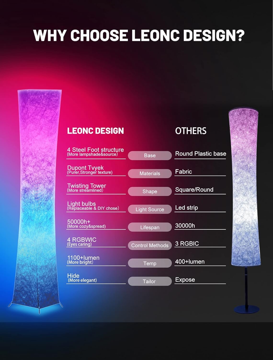 Dynamic Rgbicw Color Floor Lamp:Leonc Design Rgb Floor Lamp Provides Features 16 Million Color And Multiple Lighting Modes Dynamic Light Effects To Create Fantastic And Immersive Lighting Atmosphere For Your Space. | Energy-Efficient & Versatile Bulbs Built-In High Quality 9W