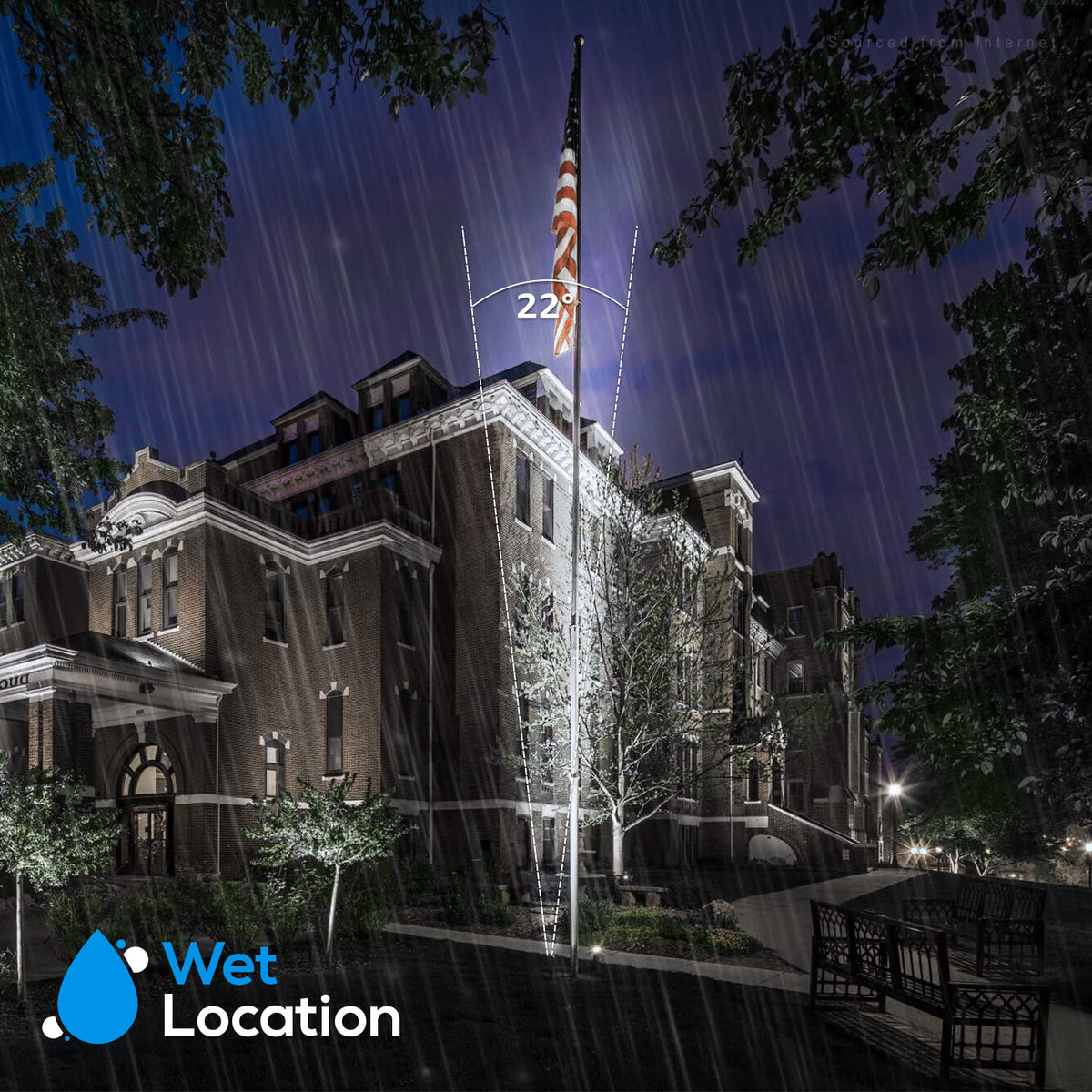 Outstanding Lighting This light's high quality LED chips lets it use only 30W to deliver 4000lm of high brightness. The 22° beam angle creates more accurate and focused lighting while the wet location rating makes it perfect for buildings, flags, and so much more.