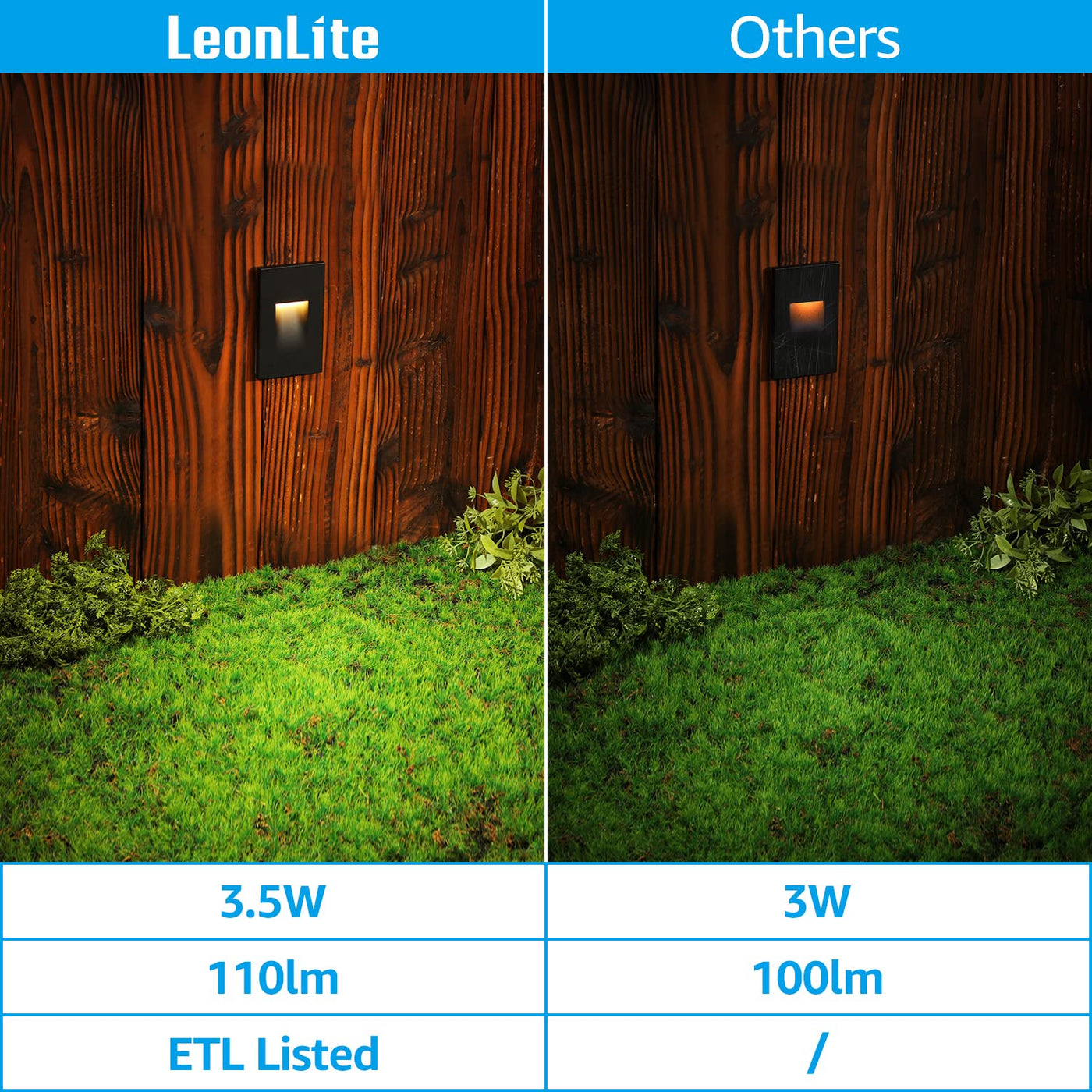 Q: What is the lifespan and energy efficiency of these step lights?A: The LEONLITE step lights have an impressive lifespan of 30,000 hours and consume only 3.5 watts of power, providing 110 lumens of glare-free illumination. This energy efficiency helps reduce electricity costs while ensuring long-lasting performance.