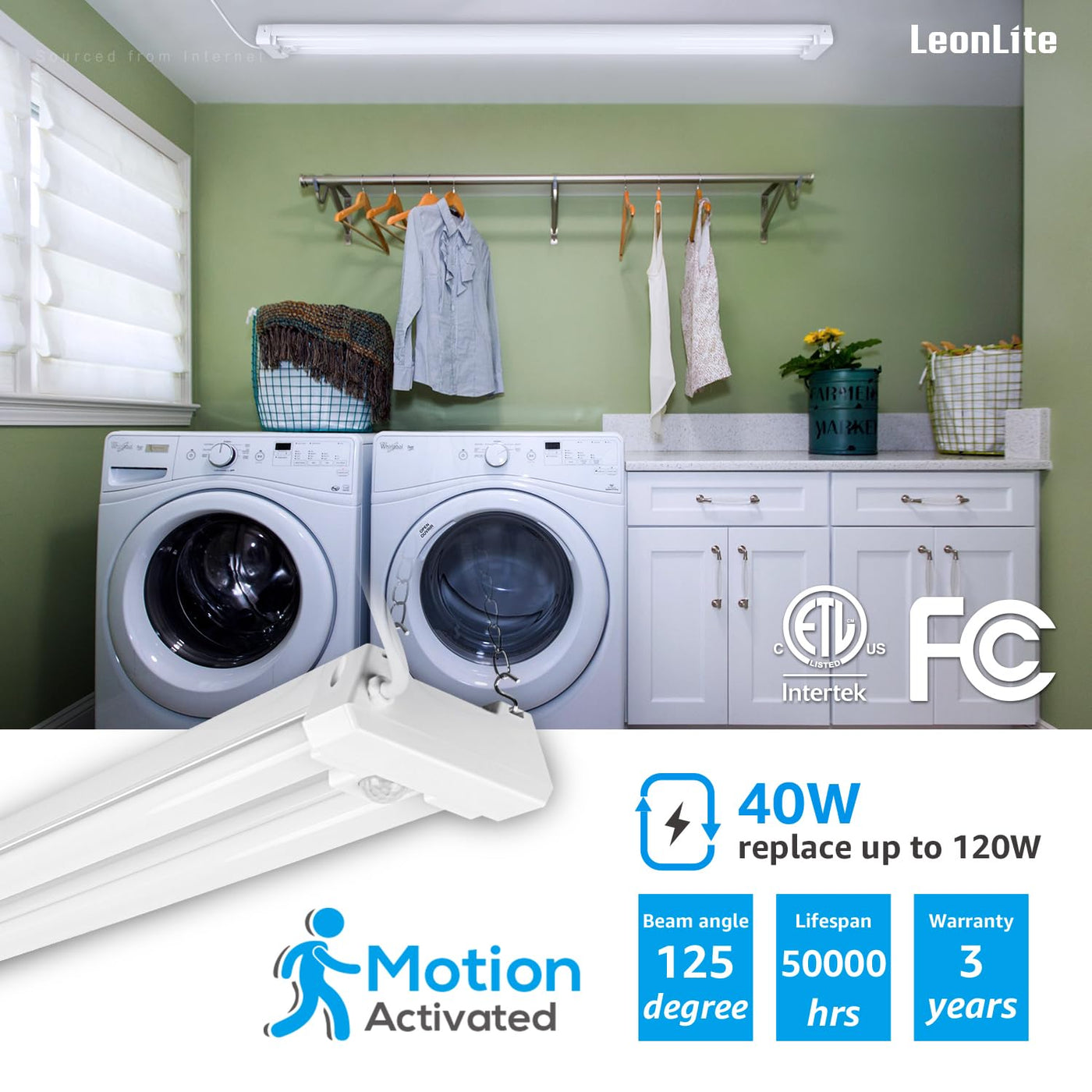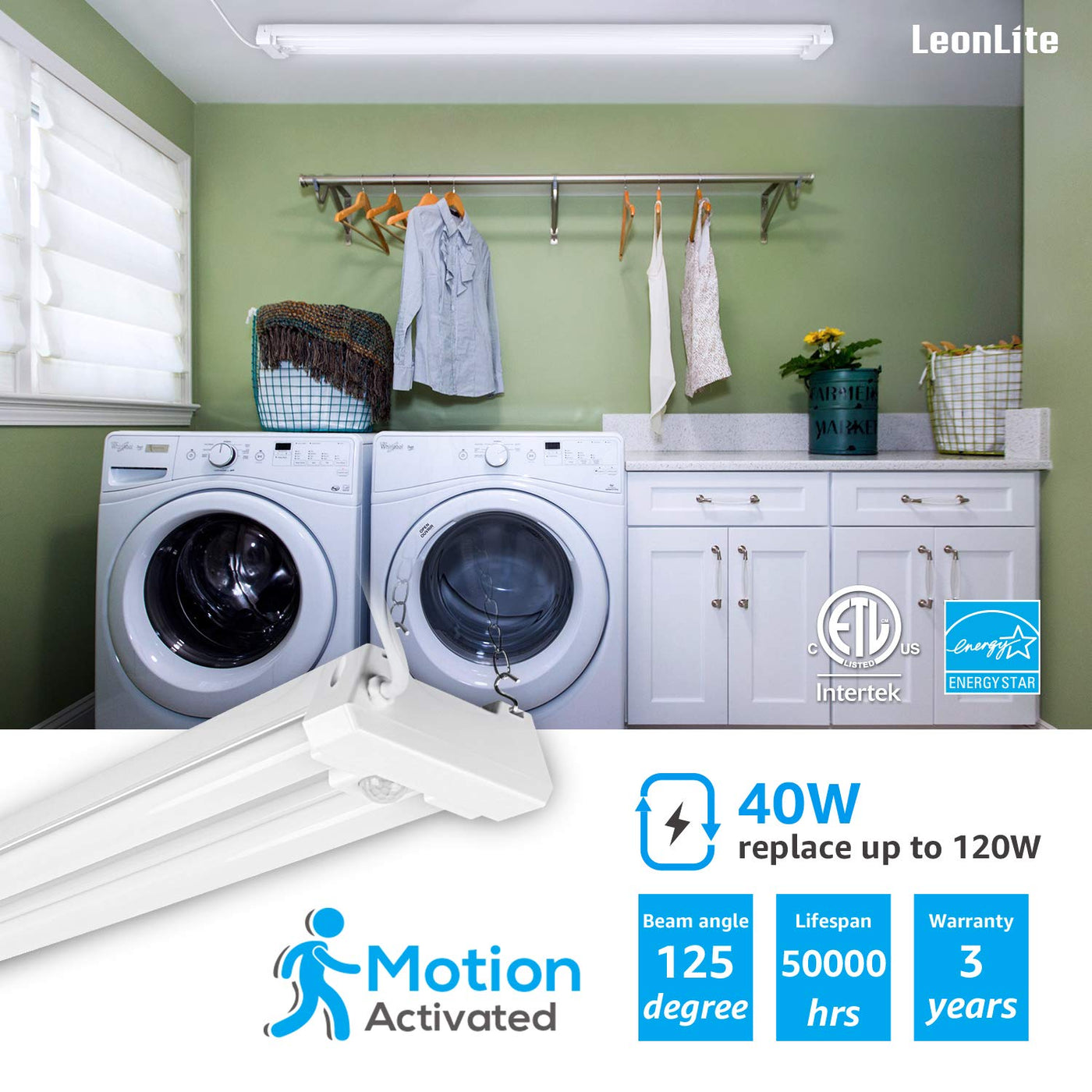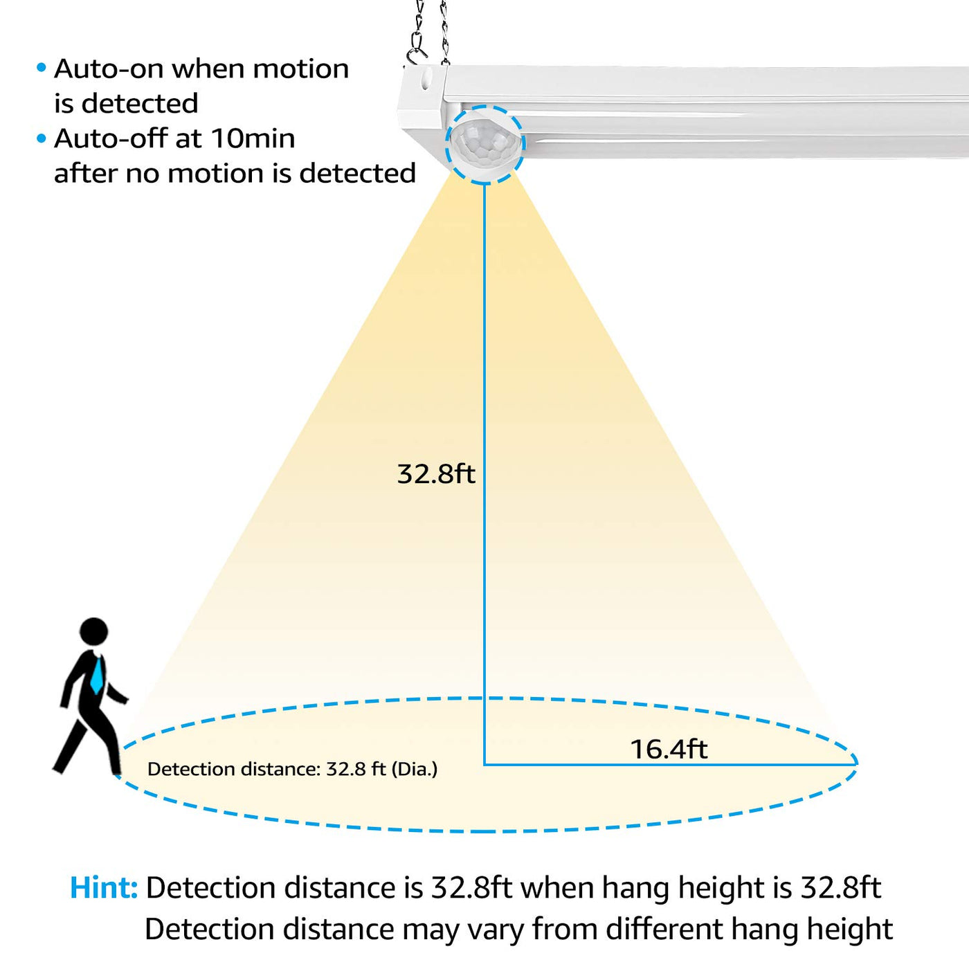Q: How does the motion sensor work on the LEONLITE LED shop light?A: The built-in motion sensor detects motion within a 16.4ft radius, automatically turning the light on when motion is detected and off after 10 minutes of no motion. This feature enhances energy efficiency and convenience.