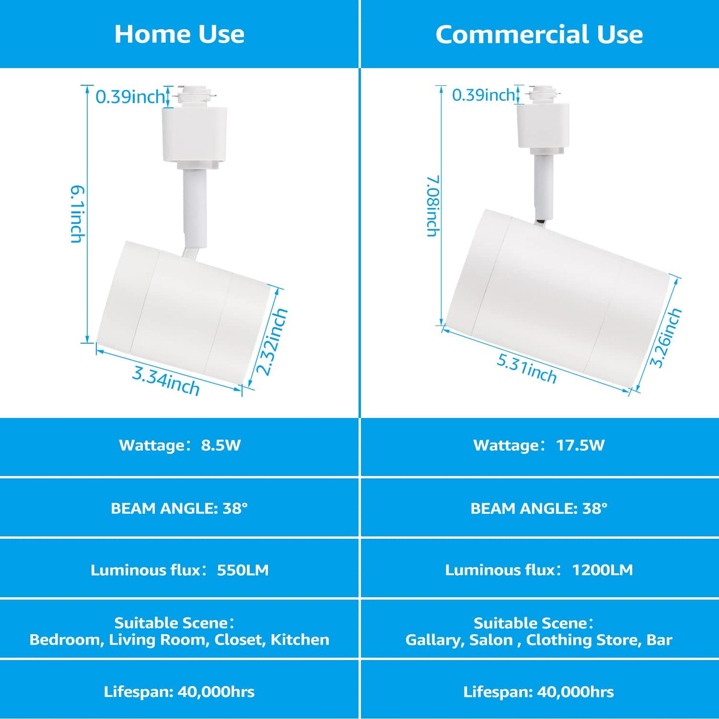 The 8.5W track light head is designed with 36° beam angle and 600lm, comes in 2700K soft white, it produces a comforting warm tone spotlighting. Adjustable head making it perfect for accent lighting. Suitable to use it for general lighting in kitchens, living rooms, dressing rooms, wine cells, and retail display lighting.