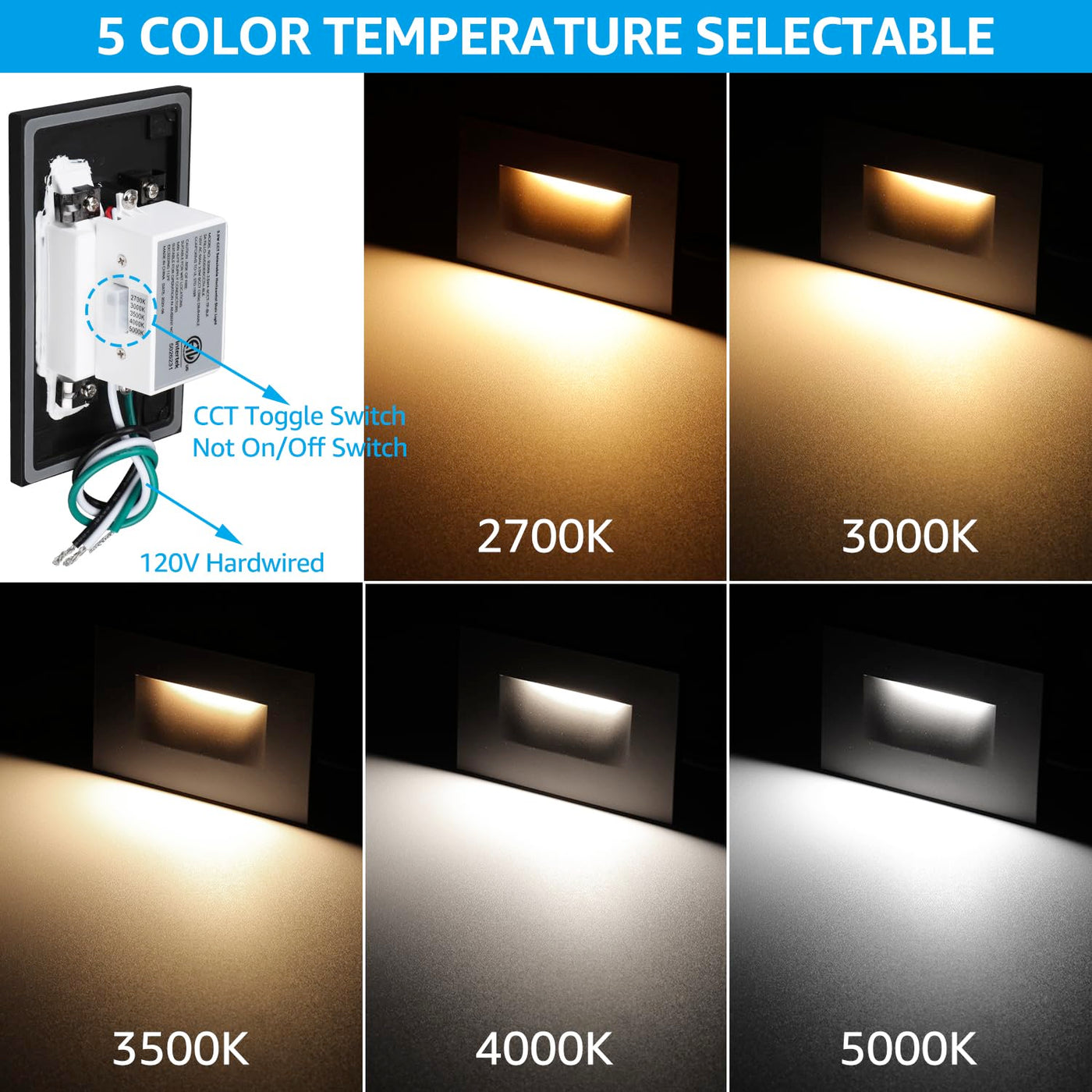 Q: What color temperatures are available for the LEONLITE LED Step Lights?A: The LEONLITE LED Step Lights offer five selectable color temperatures: 2700K, 3000K, 3500K, 4000K, and 5000K. This versatility allows you to match the lighting to your existing home decor and enhances the overall aesthetic.