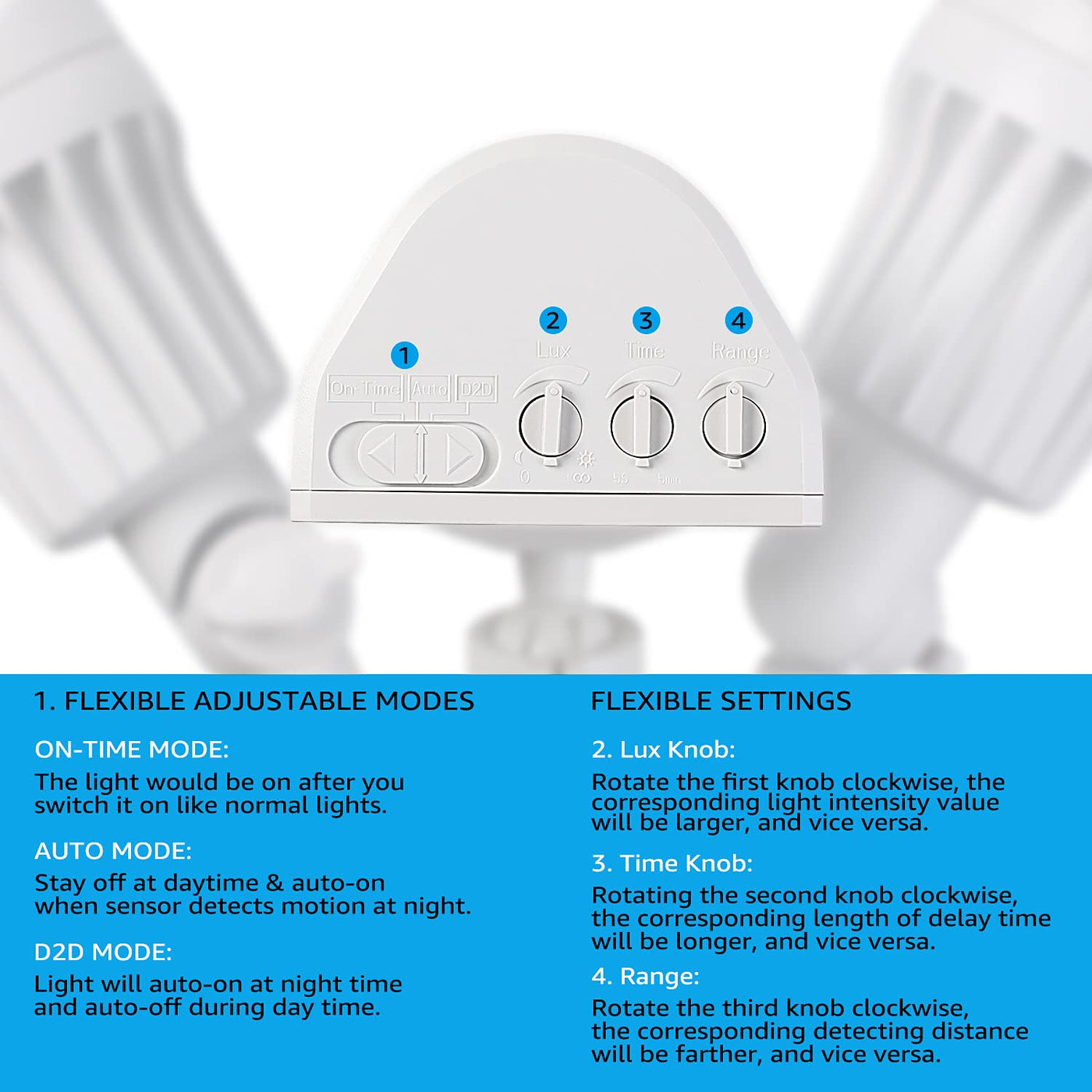 3 Operation Modes: ON-TIME MODE: Operating like a normal light bulb, lux and time range button become irresponsive. AUTO MODE: a.Adjust range to max first, then adjust your lux secondly. While lux is adjusted to maximum at sun, the light will be turned on any time during the day and night, and the light will only last for the certain amount of time set up by the TIME switch. b.While lux is adjusted to minimum, during the day when motion is detected, the sensor will flash an indicator light twice without turning on the main light; During night, the main light will be turned on with motion is detected and auto off with a delay of the TIME you set. D2D MODE (Dusk to Dawn): Adjust your lux to its minimum, then with 5-50 lux lighting environment, the light will be on regardless motion, when day comes and the lighting environment reaches 35-400 lux, the light will be turned off with a delay of the TIME you set. P.S. Each Lighting mode is controlled by adjusting the switch on the left side.