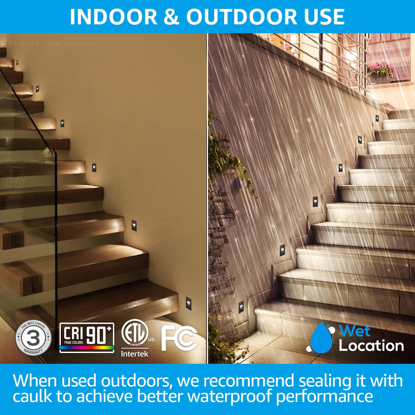 Q: Are these step lights suitable for outdoor use?A: Yes, these step lights are designed for both indoor and outdoor use. They come with rubber waterproof rings and are rated for wet locations, making them ideal for outdoor stairways and pathways.