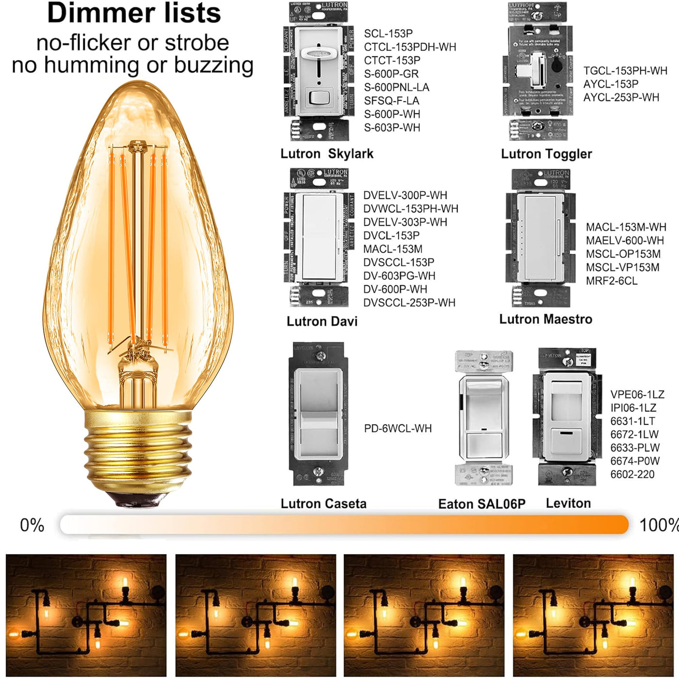 FIXTURE APPLIED - F15 e26 led bulb extensively applied for wall sconces, indoor or outdoor. Typically used for home or commercial decoration. Kitchen, living room, bedroom, bar, coffee shop, restaurant,dining room light bulbs,vanity light bulb,candle bulbs,rustic decoration,wall fixture,accent light fixture,glass fixture,wall sconce,exit sign,indoor and outdoor fixtures. Features: ? Dimmable:Smooth dimmable 0%-100% ? No flicker ? Instant On ? Non buzzing or non humming ? Amber bulb ? Color Rendering Index (CRI) 90+ SPECIFICATIONS : ?Wattage:6W ?Voltage: 120V AC ?Lumen output: 750LM ?Color temperature: 2700K ?Socket: E26 ?Size: 4.33in*1.78in*1.78in ?Package Included: 6 x 8W F15 Amber Edison Style LED Filament Bulb. Cautions : 1. Easy to install, just 3sec to screw in the Edison bulb, the E26 base fitting for most light fixtures 2. Switch off the power before replace the lamp. 3. Keep away from direct sunshine and too high temperature. 4. If any doubt about the installation or use of this product, please consult a competent electrician. 5. If you are not 100% satisfied with your purchase or there is any damage in transit we will make it right. We are committed to responding to any request within 12 hours.