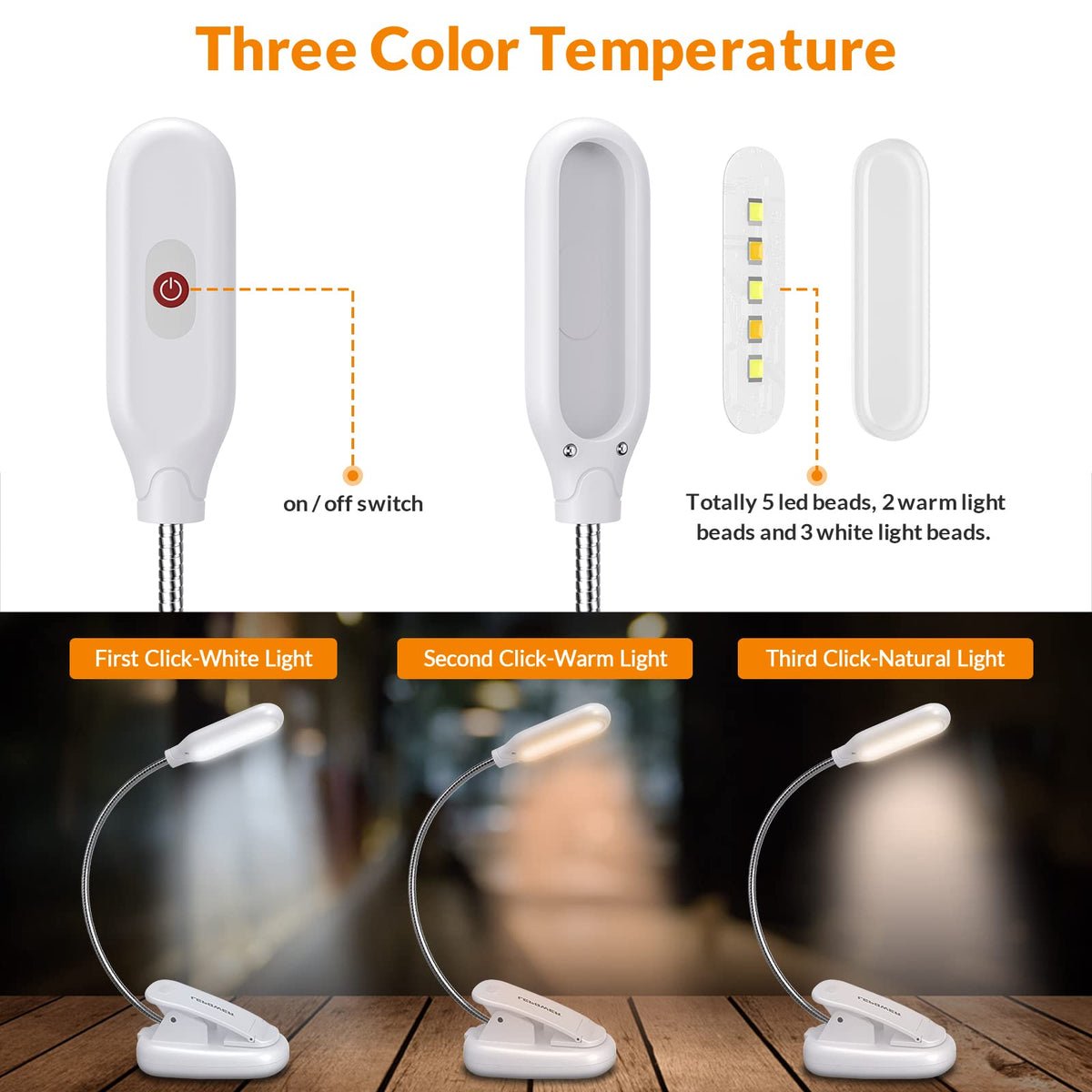 Lepower Clip-On Book Light With 5 Led Eye Care, 3 Color Changeable, Portable Reading Lamp, Battery Operated, Bed Light For Kids,