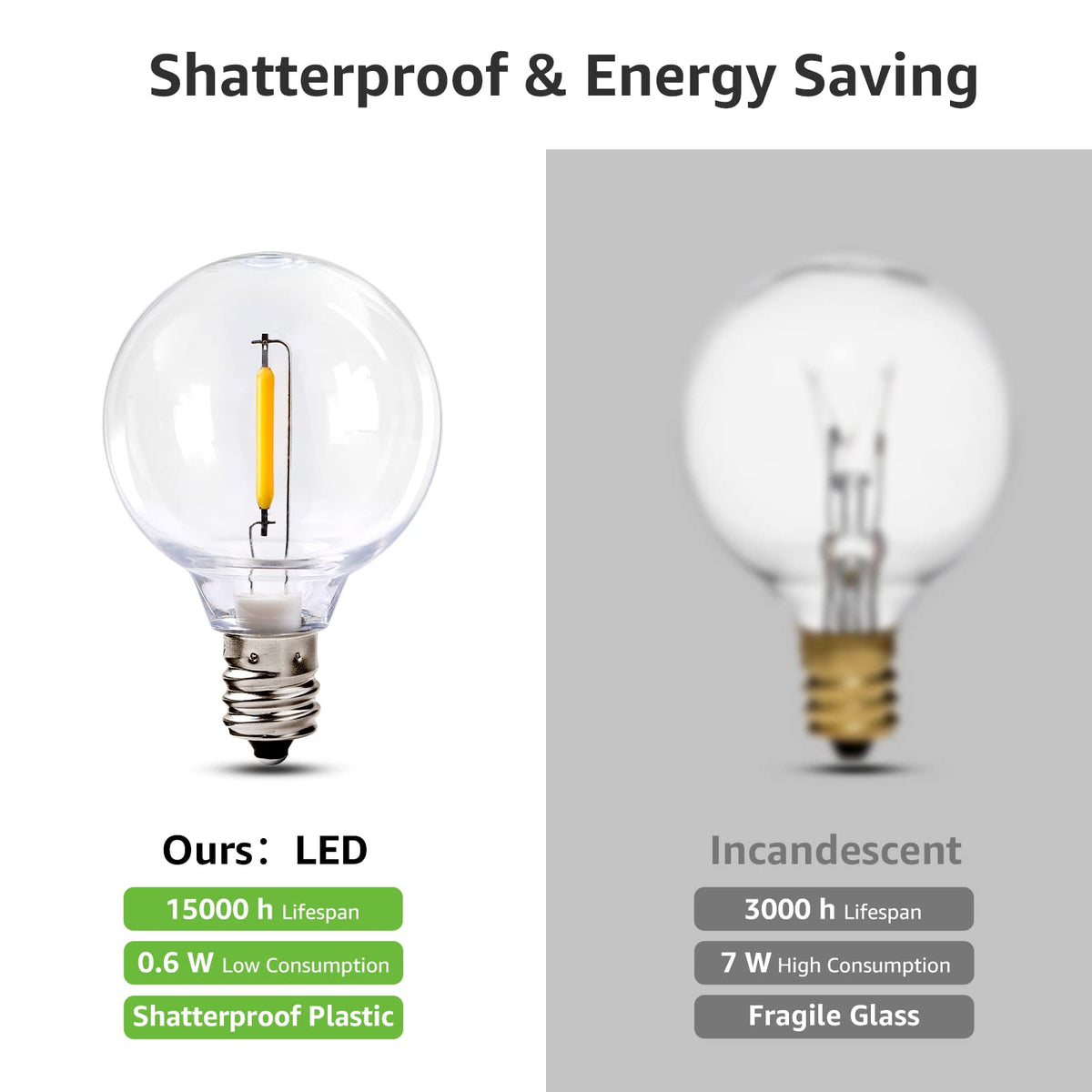Q: Are the G40 globe bulbs shatterproof?A: Yes, the G40 globe bulbs are made from durable acrylic material that is shatterproof. This means they won't break if dropped, making them a safe choice for outdoor use.