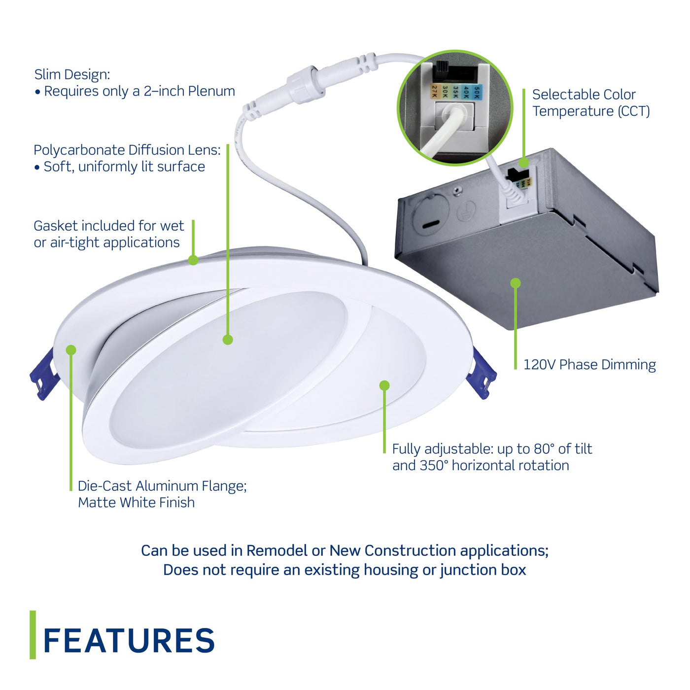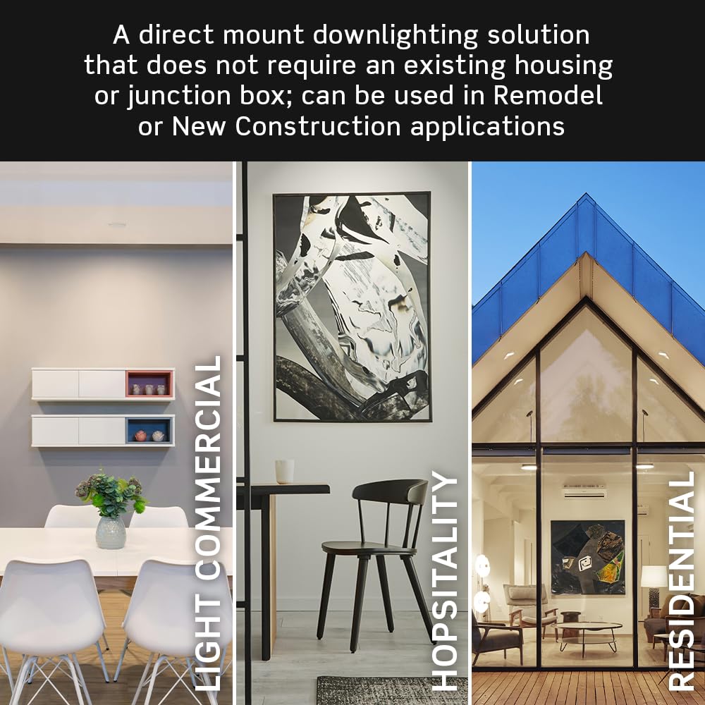 Levitons 6-Inch Round Aperture Adjustable Slim Downlight, With Selectable Color Temperature, Offers The Performance, Ease Of Use And Flexibility Valued For Todays Residential And Light Commercial Applications. A Direct Mount Downlighting Solution That Does Not Require An Existing Housing Or Junction Box And Is Fully Adjustable: Up To 80 Of Tilt And 350 Of Rotation. Users Can Change The Color Temperature Of The Light Between 5 Different Values Ranging From 2700K To 5000K With A Simple Switch. Pair This Downlight With One Of The Many Leviton Compatible Dimmer Control Options To Adjust For The Desired Light Level. A Total Lighting Solution That Will Provide Years Of Quality Illumination And Reliable Performance. Compatible With Leviton Dimmers: Sureslide: 6674, 6674N, 66Df, Decora Smart Wi-Fi: D26Hd, Dn6Hd, D2Msd, Dwvaa, Decora Smart Z-Wave: Zw6Hd, Decora Digital: Ddl06-Bl, Ddm06, Ddmx1, Dde06, Decora Slide: Dse06, Dsm10, Dsl06, Decora Evolve: Vm2D3, Vmdd3, Illumatech: Ipe04, Ipl06, Trimatron Rotary: Rdl06, Rnl06, Toggle Slide: Tsl06, Tsm10.