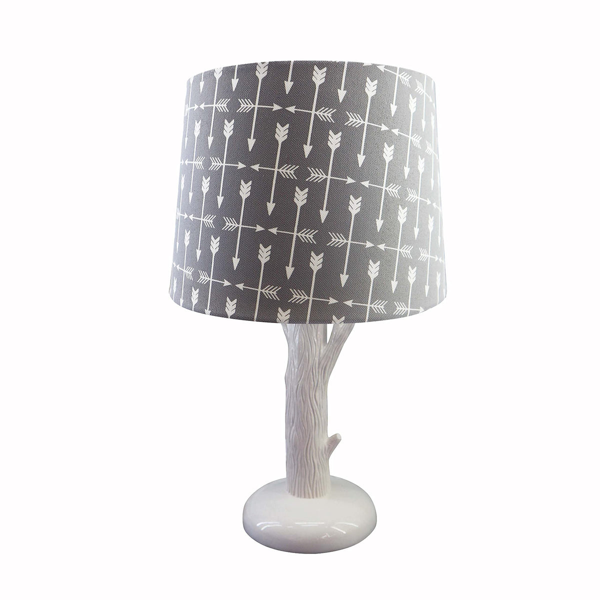 LEVTEX BABY TRAIL MIX : A beautiful accessory for any baby nursery, the Trail Mix lamp features an adorable hand painted tree shaped base in off-white with a pattern of white arrows ona grey shade to brighten and soften the nursery. The base and shade is 16 in. high and 8 in. diameter making it an easy fit in any nursery.