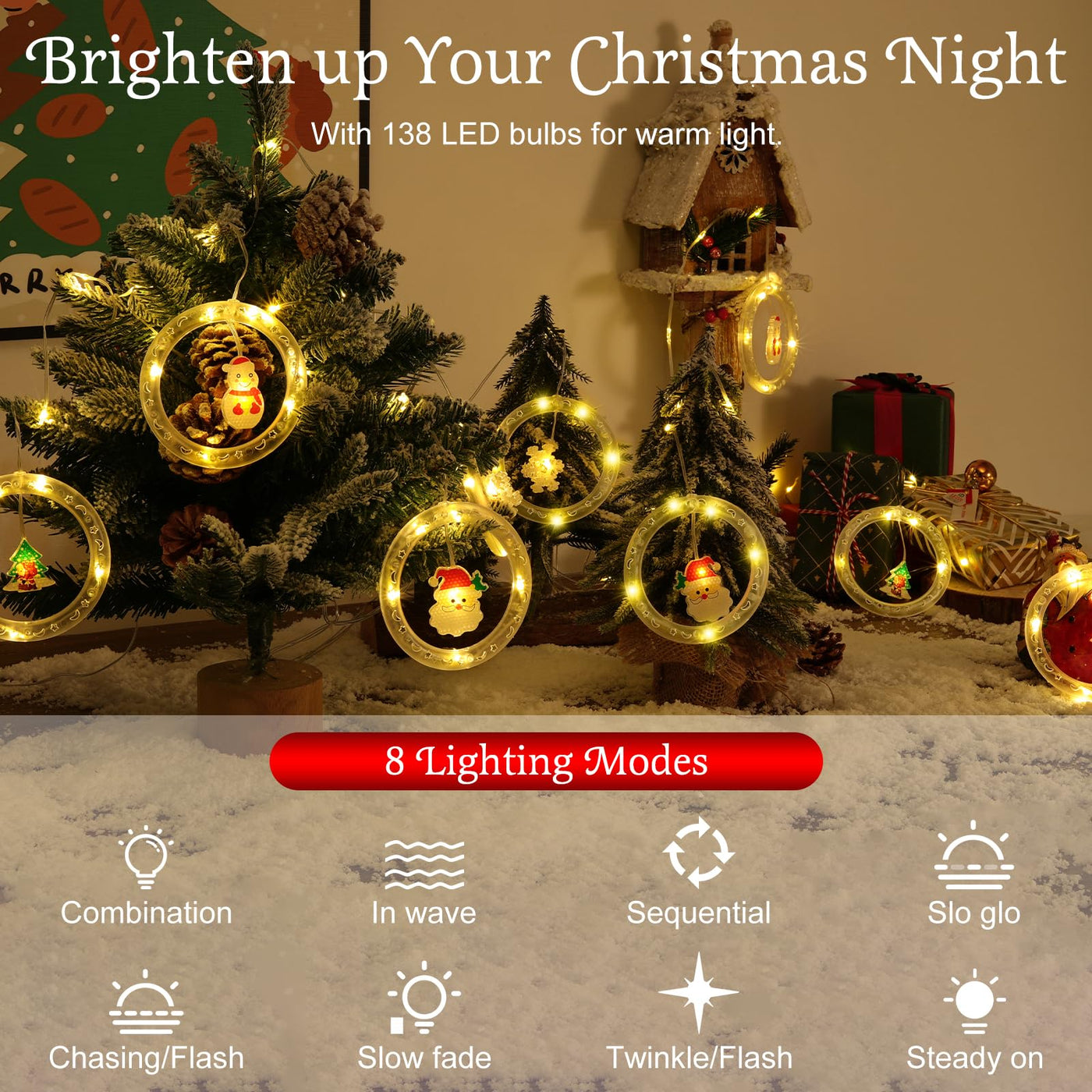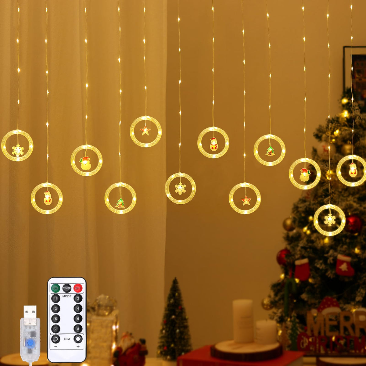 ?Christmas Home Lights?Welcome the wonderful Christmas with charming lights! Our curtain home lights collect all the wonderful Christmas elements, such as Christmas trees, Santa Claus, stars, hearts, etc. Hang it in the room to create a romantic holiday atmosphere. | ?Adjustable Lights & 6Hrs Timer?The Christmas home lights feature 8 light modes and 4 brightness, enjoying different lighting effects to meet all your needs. Built-in timer, they will automatically light up for 6hrs and light off for 18hrs, so as to keep cycling. No need to worry about forgetting to turn off the power! | ?USB Powered?Plug the 3m USB power cord into a power source (NOT Included), so light up the curtain home lights in other cases. Short press the USB button to select 8 lighting modes or light on/ off. | ?Safe & Lasting?The fairy lights for bedroom feature low consumption and high efficiency, which is secure and energy-saving. Even if they are used for a long time, they have no risk of overheating and are safe to touch. Made of high-quality plastic material, they have great light transmission, not easy to deform and damage. | ?Ideal Christmas Decoration?The hanging fairy lights are embellished with classic Christmas patterns and blend the great Christmas spirit, perfect as holiday lights to decorate fireplaces, windows, Christmas tree, party, etc. Let the charming lights warm your Christmas moments! Gift it to your loved ones, like family, friend, lover, mother, conveying your blessing!