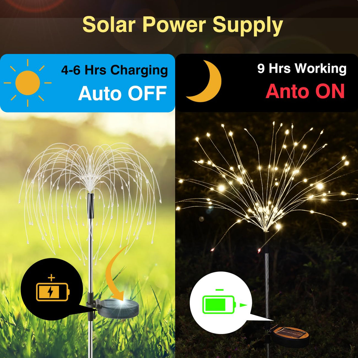 Q: How long do the solar lights work after charging?A: After a full charge of 4-6 hours in direct sunlight, the Lewondr Firework Solar Garden Lights can illuminate for up to 9 hours, providing extended use during the night.
