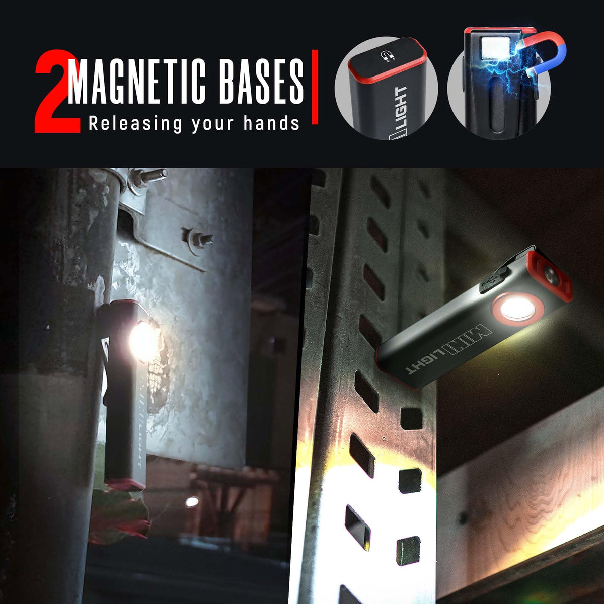 ?Dual Light Source?Two light sources of front light and top light. Maximum output of 1600 real lumens. Equipped with 3 lighting modes to meet your needs in various working scenarios. Whether you're completing delicate tasks, or needing an overnight camp, hike, or emergency backup, this LED work light can do it all. ?Ultra-Light Bright Work Flashlight?The 2-in-1 work area light has a 800 lumen led flashlight and a 1000/1600 lumen COB work light, which can give you up to 3-12 hrs. of run time. ?Magnetic & Clip Design?Our work lights are equipped with two strong magnets at the bottom and back. When you need to use your hands to operate other tools, it can be firmly adsorbed on the surface of magnetic metal objects such as vehicles and toolboxes. While freeing your hands, you can also keep the flashlight steady.
