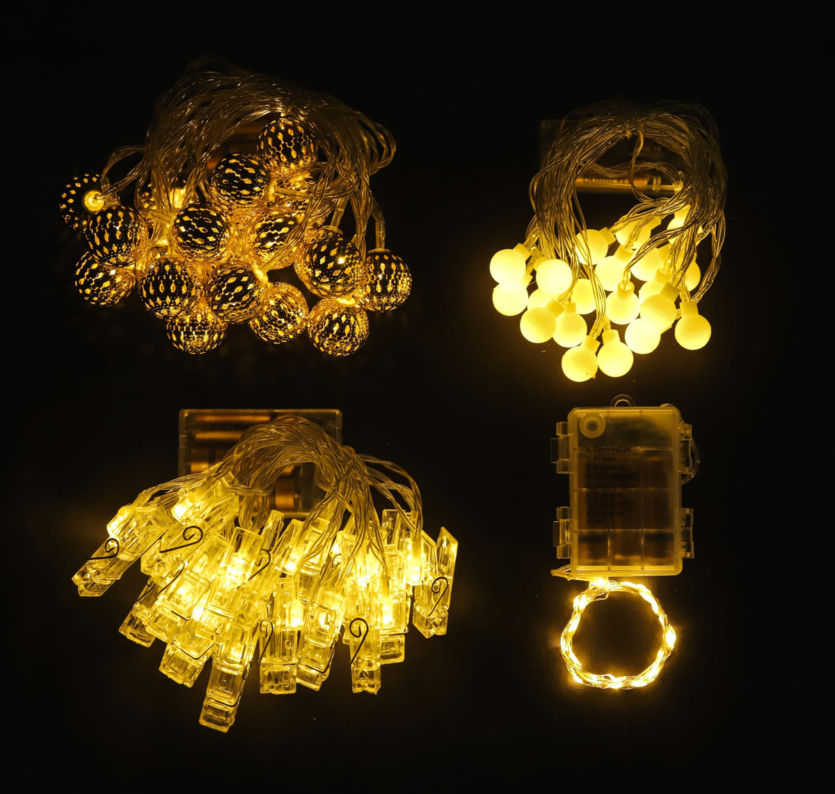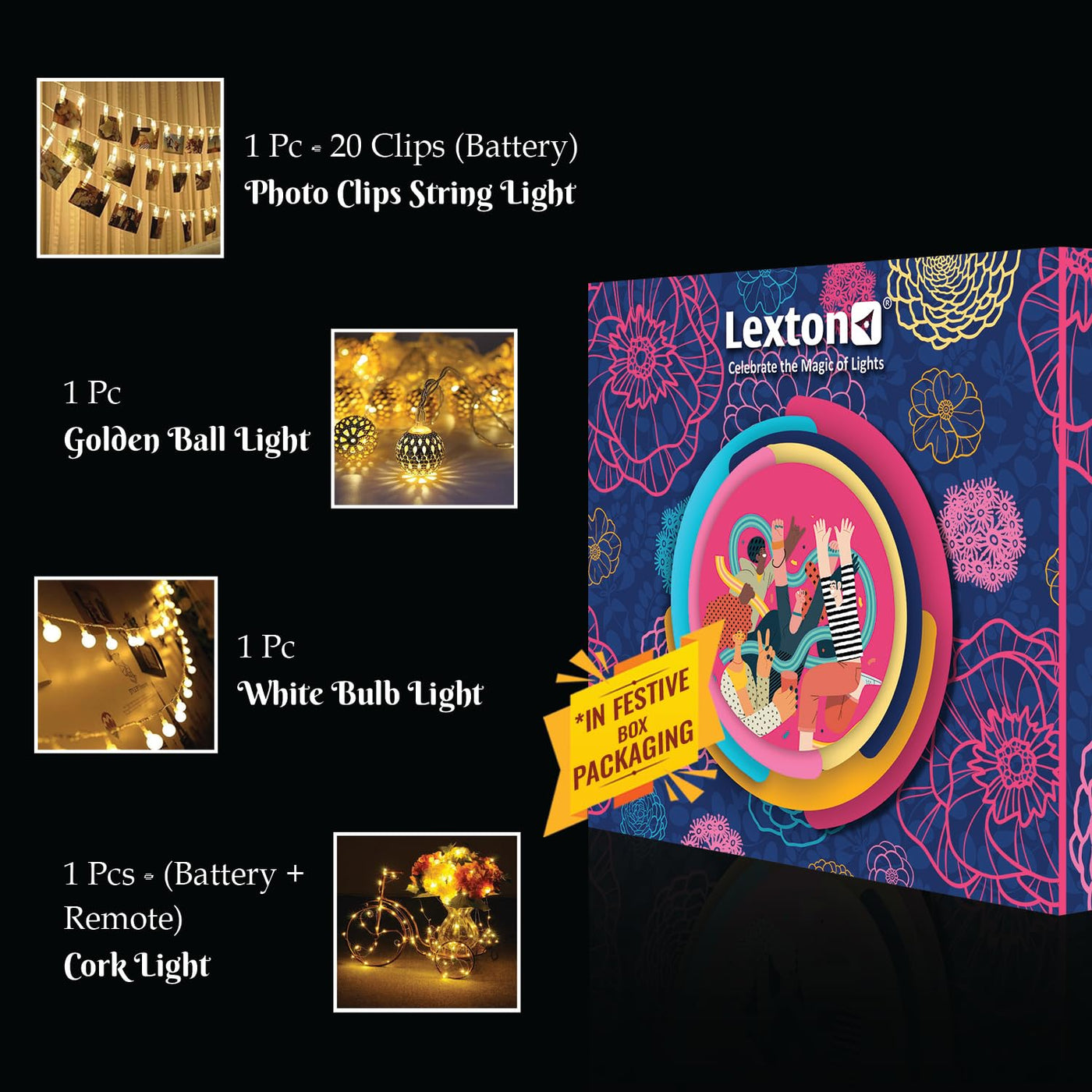 DescriptionIntroducing the LEXTON Bulb Light, Cork Light, Photoclip light and Golden Ball Light Combo an elegant fusion of versatility and charm. This set creates a captivating ambiance for any space. The warm white lights emit a soft, inviting glow, perfect for indoor or outdoor use. The curtain lights create a stunning waterfall effect, draping over windows or as a backdrop for special events. Crafted with premium materials, these lights are durable, energy-efficient, waterproof, and weather-resistant. Elevate your surroundings.