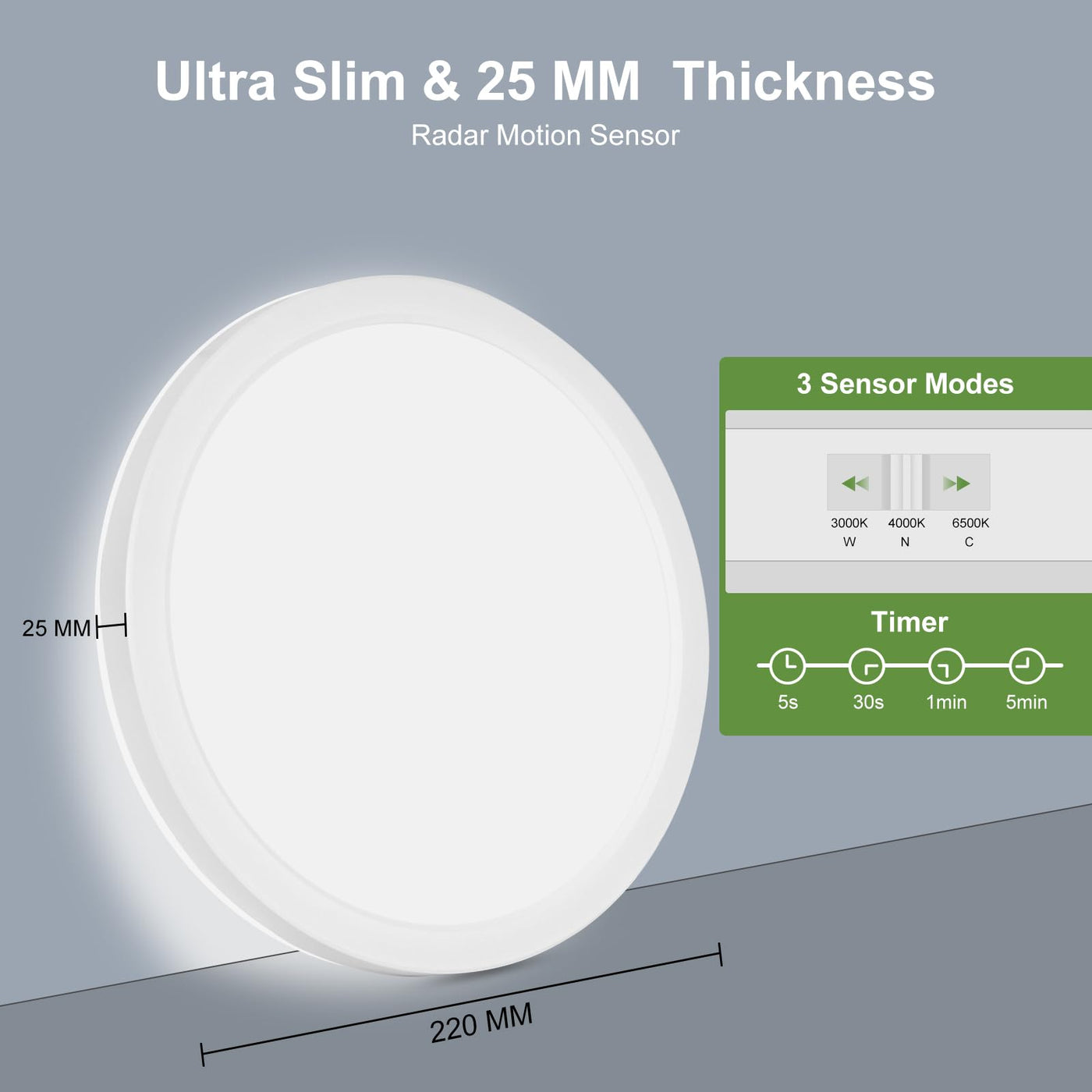 This ceiling light features a 5.8G radar motion sensing technology that automatically activates the light upon detecting motion within a selectable range of 3 to 20 feet. Once motion is no longer detected, the light turns off after a customizable duration of 5 seconds to 5 minutes. The advanced microwave sensor is more sensitive to motion and ambient light compared to traditional infrared sensors, making it a reliable choice in various environments.