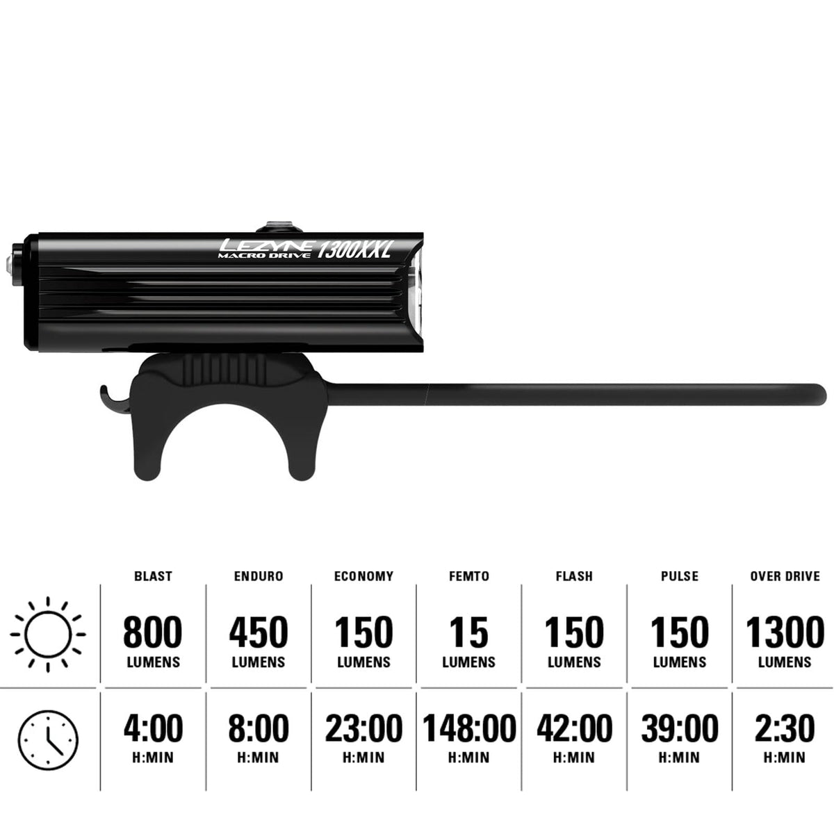 Q: How long does the battery last on the LEZYNE Macro Drive 1300XXL?A: In Femto mode, the Macro Drive 1300XXL offers an impressive runtime of up to 148 hours, making it perfect for long rides without frequent recharging.