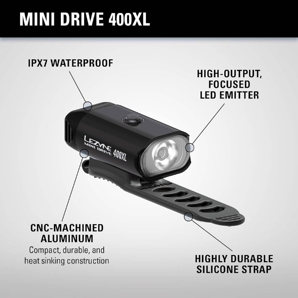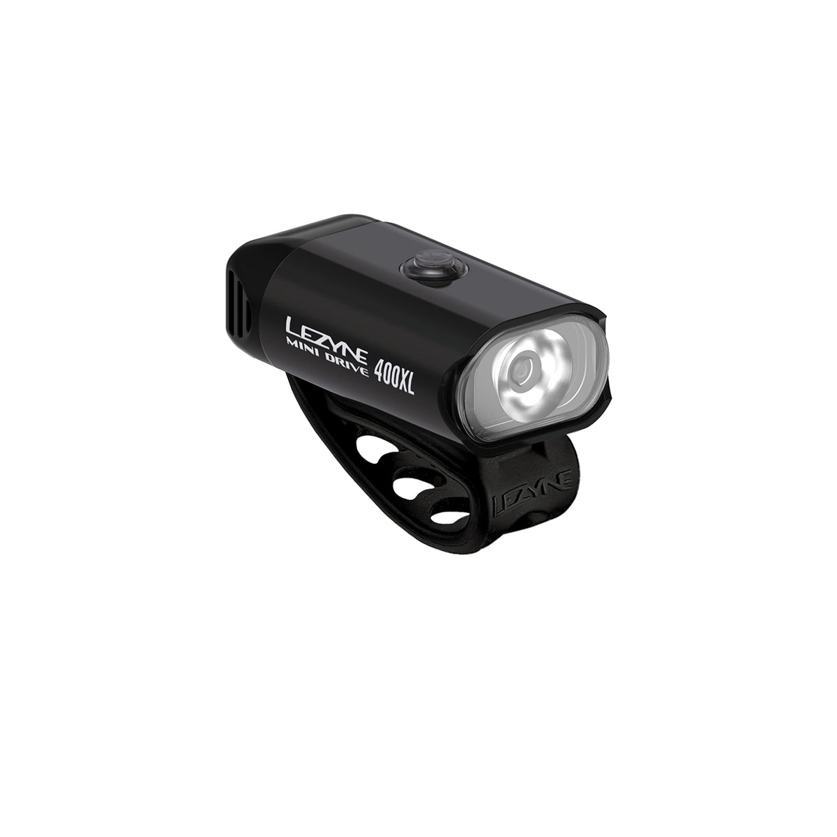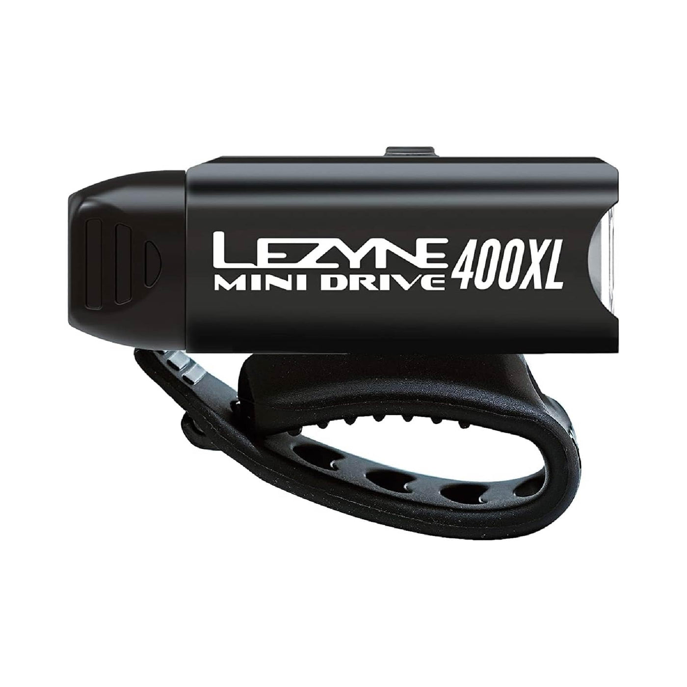 Lezyne Mini Drive 400Xl Bicycle Front Rechargeable Ipx7 White Led Road Mountain Gravel Bike Light W/Multiple Solid & Flash Modes | Integrated Versatile Mounting Strap, 400 Lumens, Gloss Black