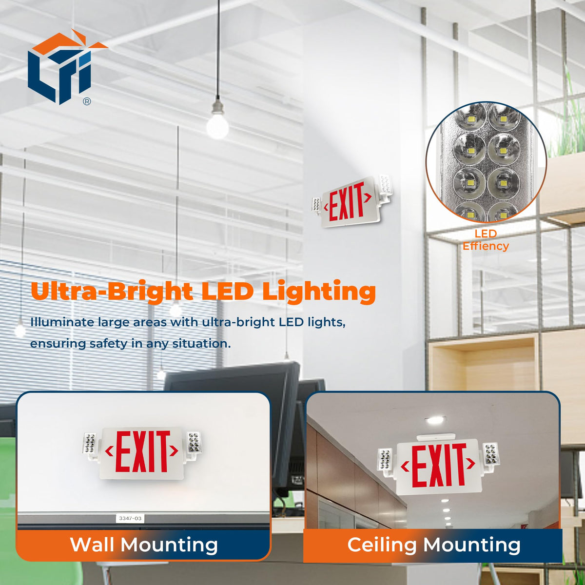 Q: Is the LFI Lights Exit Sign suitable for outdoor use?A: The LFI Lights Combo Exit Sign is designed for indoor use. For outdoor applications, ensure it is installed in a protected area since it is not specifically rated for outdoor conditions.