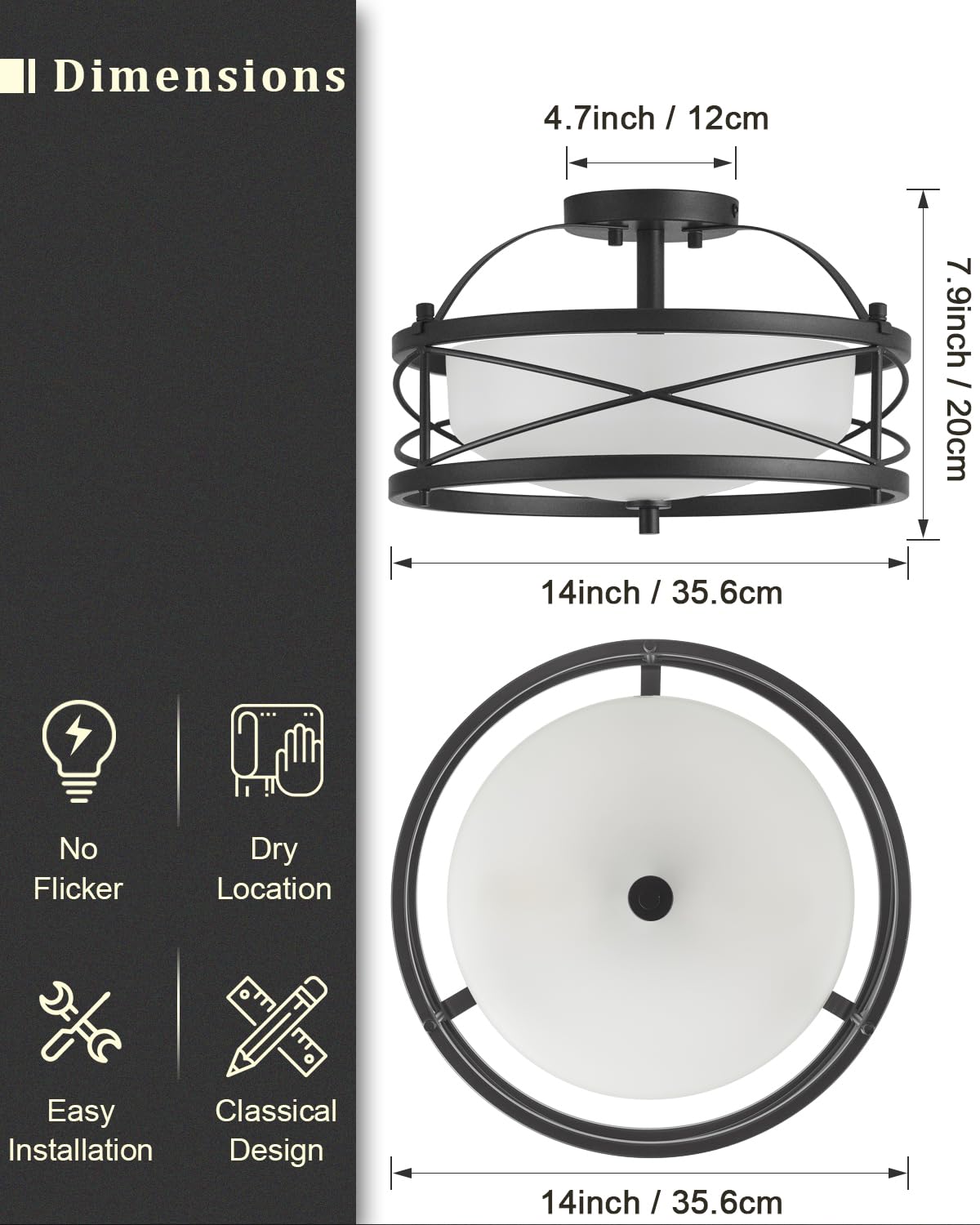 This Is An 14 Inch 2 Light Vintage Style Ceiling Light With Frosted Glass Shade And Black Matte Metal Plate. The Ceiling Light Fixture Is Very Simple In Shape And Has A Wide Range Of Applications. This Black Flush Mount Ceiling Light Is Very Suitable For American Industrial And Farmhouse Style.