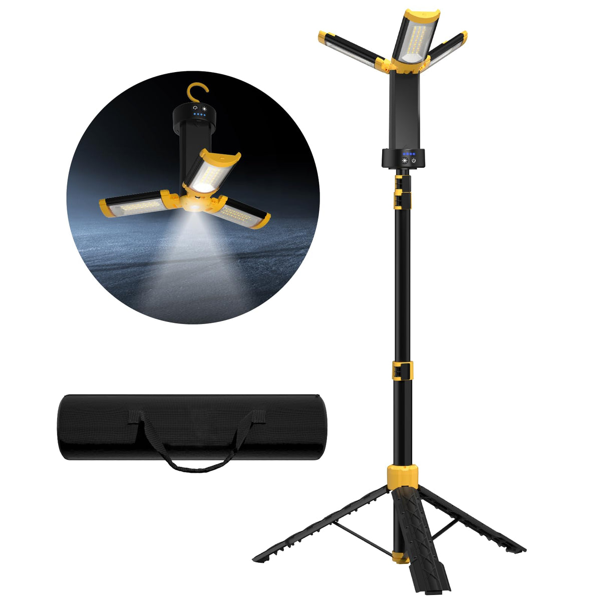 Lhotse Rechargeable Camping Light With Stand, 83" Tall Portable Cordless Work Light 3 Led Lamps Head, 9Ah Battery Led Work Light, 3000 Lumen Dimmable Camping Light With Detachable Tripod