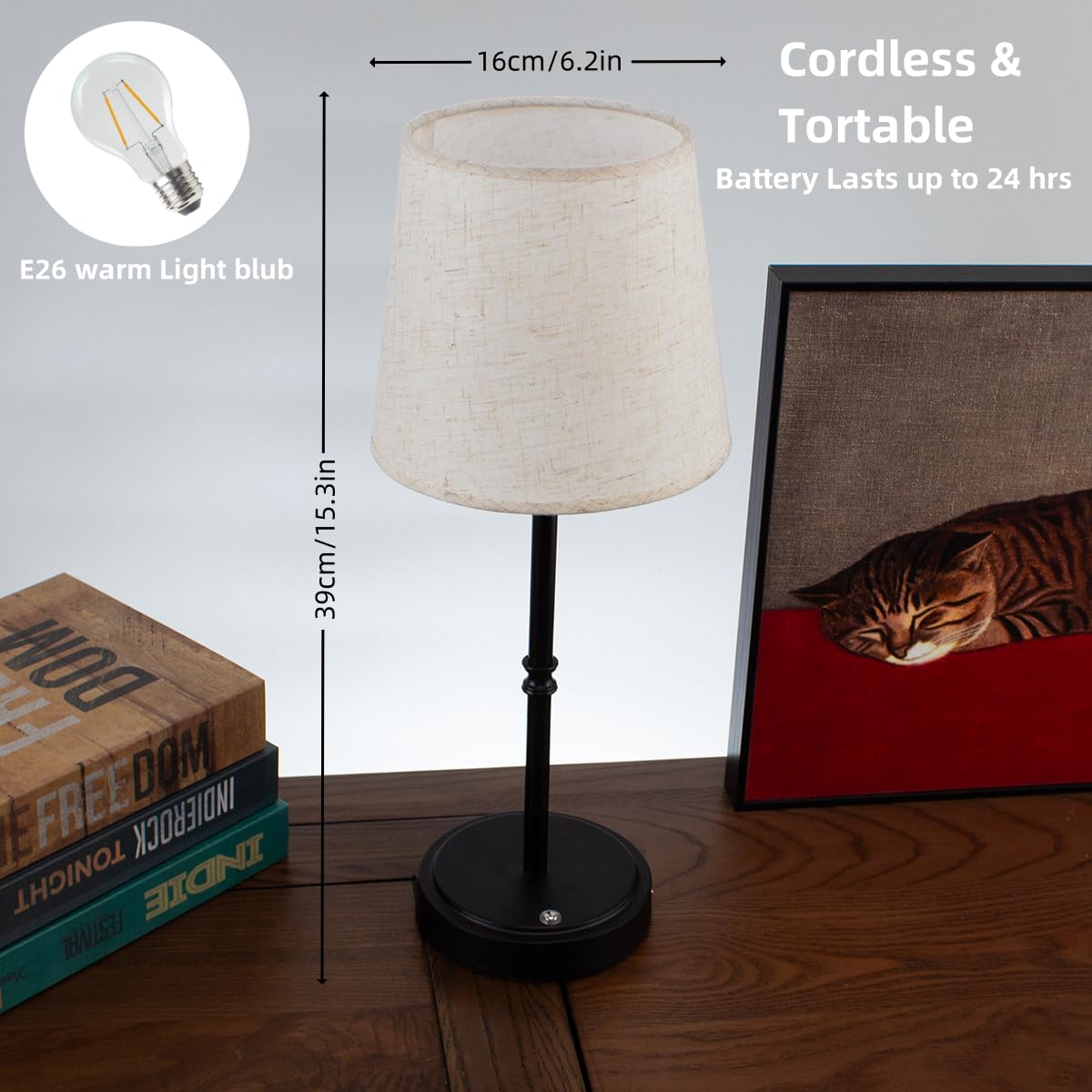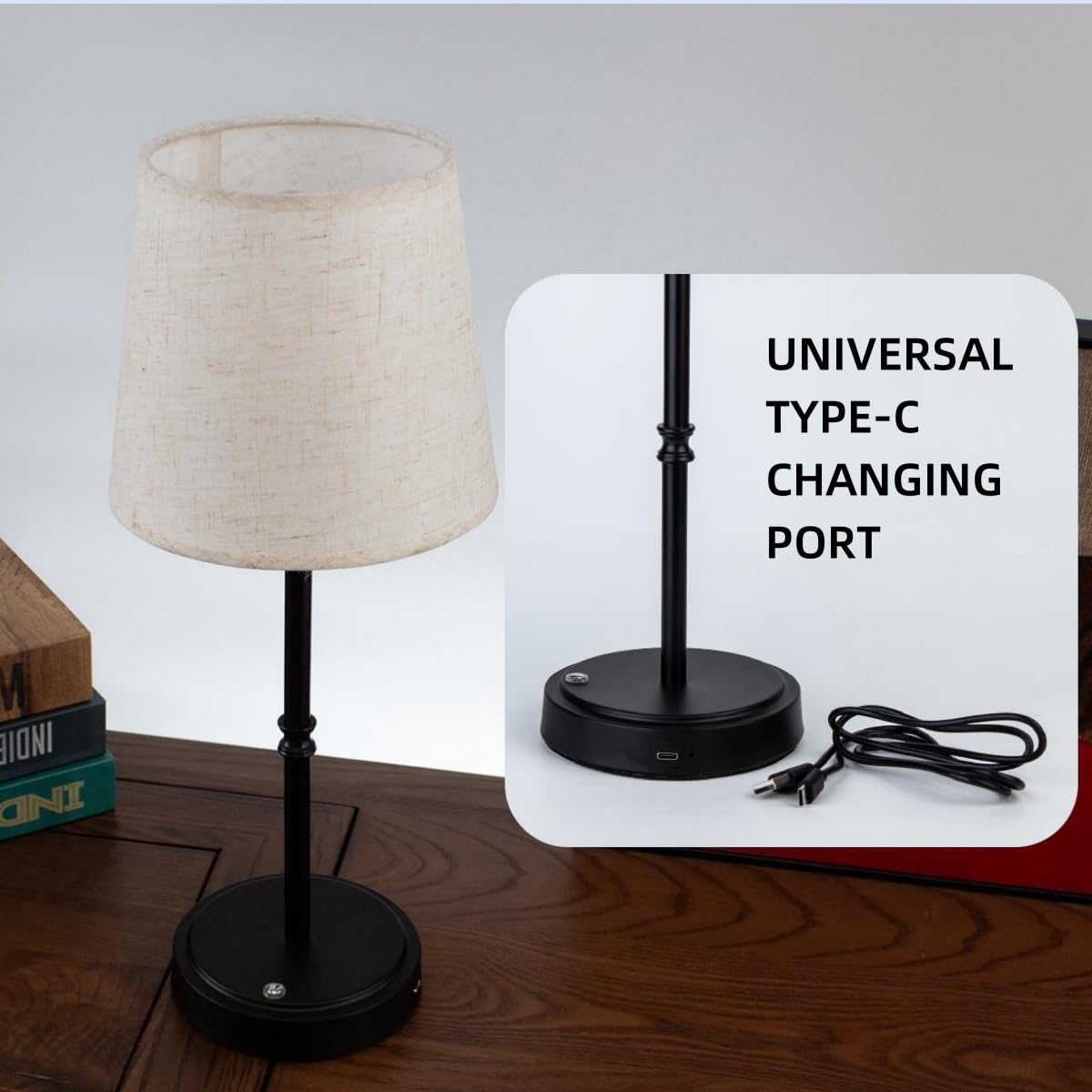 (Cordless Rechargeable Touch Desk Lamp) With One Charge, You Can Enjoy Up To 48 Hours Of Light With Three Brightness Levels: 30% For Level One, 60% For Level Two, And 100% For Level Three. The Brightness Can Be Adjusted According To Your Needs To Create A Perfect Atmosphere And Enhance Your Lighting Experience. It Adopts Linen Fabric Lampshade, And The Eternal Metal Base Bracket Design Adds A Touch Of Retro Elegance To Any Space. The Cordless Desk Lamp Has A Universal Type-C Charging Function, Making It An Ideal Choice For Multifunctional Lighting In Your Home Or Covered Outdoor Areas For Easy Use.