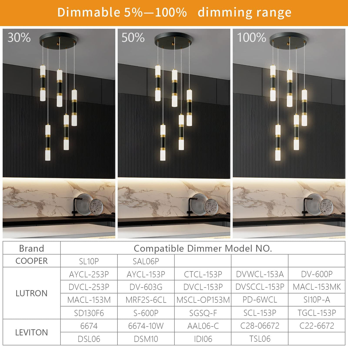 Q: What is the dimming range of the LIANGMH 5-Light Pendant Light?A: The LIANGMH 5-Light Pendant Light features a dimming range from 5% to 100%, making it compatible with most household thyristor LED dimmers for smooth operation without flickering.