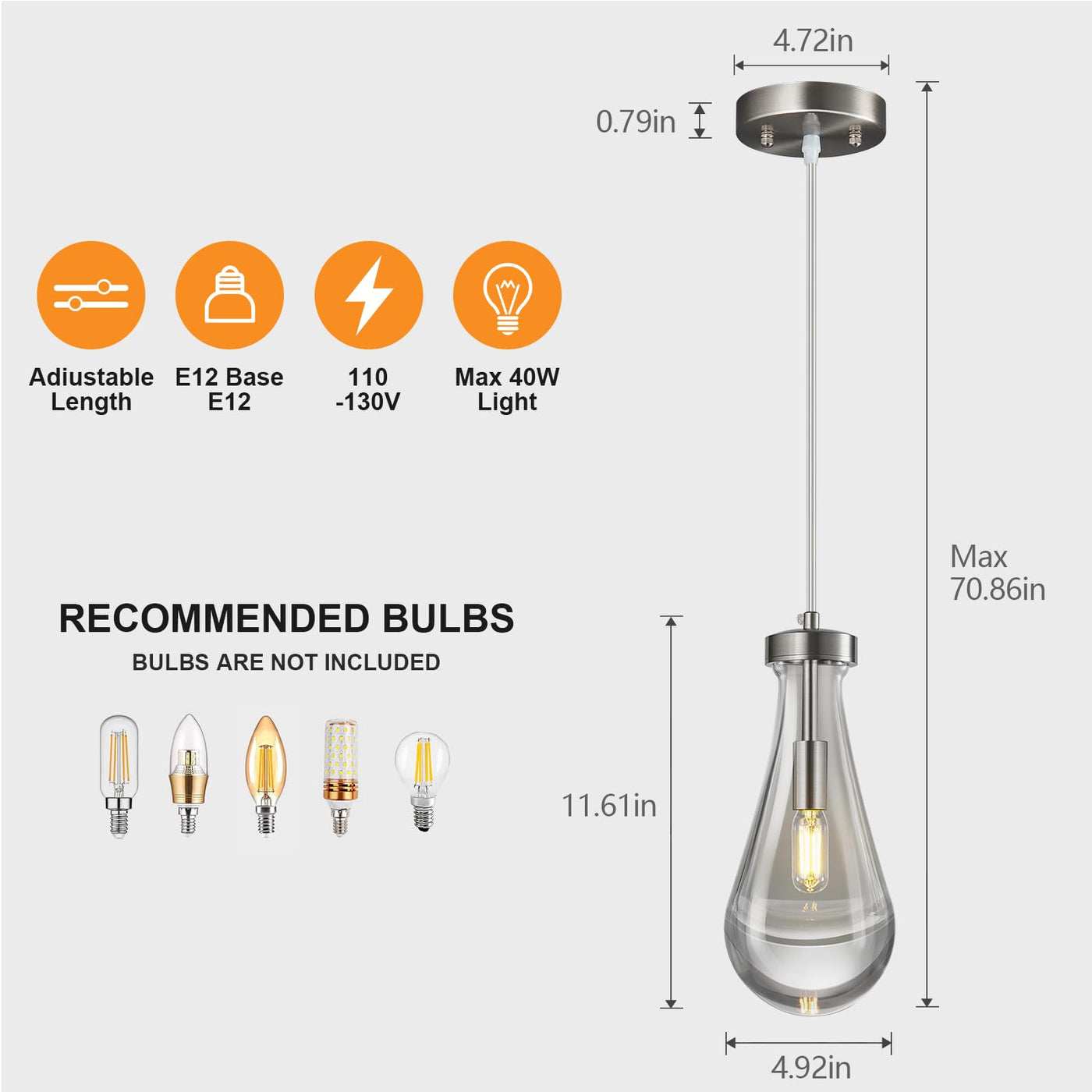 Liangmh Raindrop Pendant Lights Kitchen Island Teardrop Nickel Hanging Light Fixtures Clear Solid Glass Pendant Light Modern Cha
