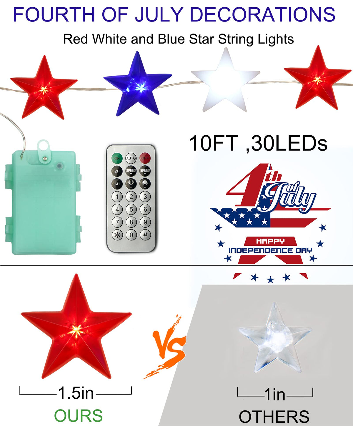 Specifications Shape: Star Star Size: 3.15 Inch / 8 CM Color: Red, White and Blue Light Color: Red and Cool White Total Length: 10FT Lights Source Type: LED Number of Lights: 30 LEDs Battery Powered:3 AA batteries(not include)