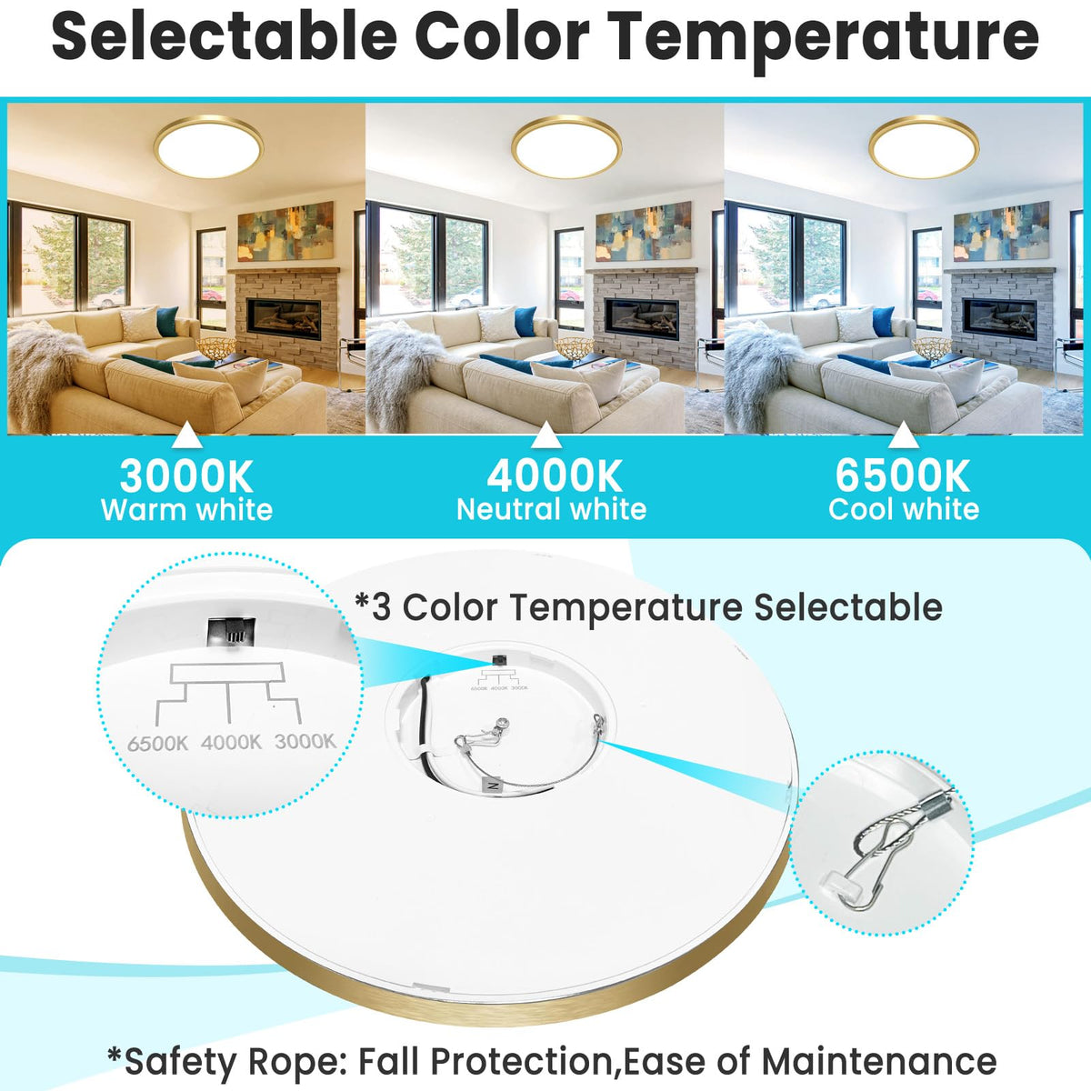Three selectable color temperatures: 3500K warm white, 5000K neutral white, and 6500K daylight white.