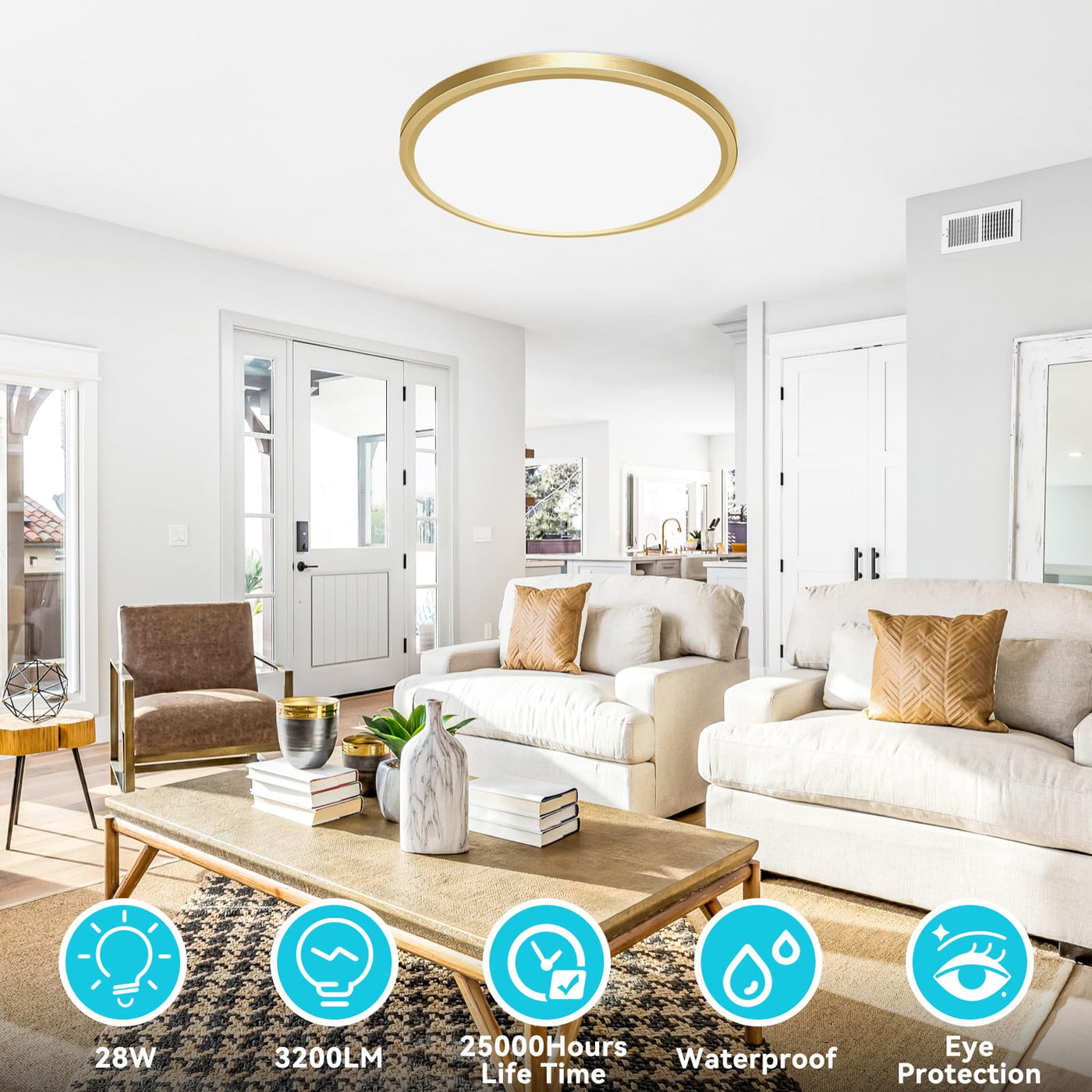 With a 12-inch diameter, this gold ceiling light is not only a stylish addition to your home but also an efficient lighting solution. It offers an impressive brightness of 3200 lumens, comparable to a traditional 280W four-bulb setup, making it an energy-saving alternative that reduces electricity costs. The fixture features three adjustable color temperatures—warm white, neutral white, and daylight white—allowing you to create the perfect ambiance for any occasion. Installation is straightforward, thanks to its surface mount design, enabling quick setup without specialized tools. Made from durable plastic, this light fixture is built to last, with a lifespan of up to 50,000 hours.