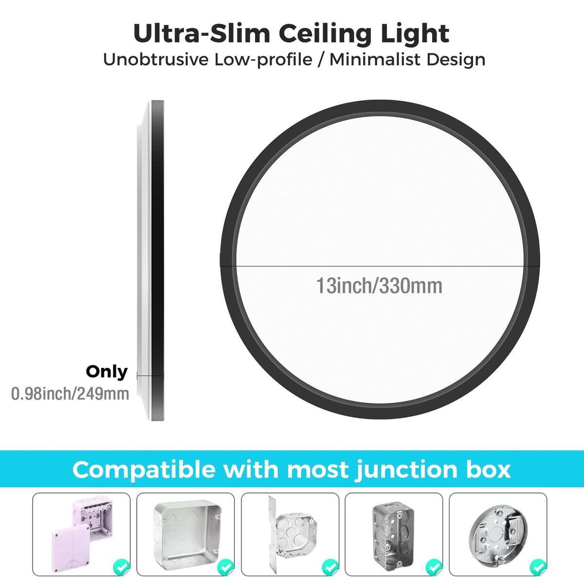 This 13 Inch Black Flush Mount Ceiling Light Is The Perfect Addition To Any Modern Or Contemporary Space. With Its Sleek And Ultra-Slim Design, This Ceiling Light Emits A Powerful 3200 Lumens, Providing High-Performance Lighting That Illuminates Any Room With Ease. This Bathroom Ceiling Light Also Offers The Option To Customize The Lighting According To Your Preference. With The Included 3000K,4500K And 6000K Color Temperature Options, You Can Easily Switch Between Different Lighting Options To Create The Desired Ambience In Any Room. This Flush Mount Ceiling Light Is Super Bright, Providing Ample Illumination That Evenly Covers The Entire Space. Whether You Need Intense Lighting For Cooking In The Kitchen Or Gentle Lighting For Relaxation In The Bedroom. Installing This Led Ceiling Light Is A Breeze. It Comes With A User-Friendly Installation Manual And All The Necessary Hardware, Making It Easy For Anyone To Mount It On Their Ceiling. No Need To Hire A Professional Electrician - You Can Do It Yourself! Made From High-Quality Materials, This Ceiling Light Is Built To Last. Its Sturdy Construction Ensures It Can Withstand Everyday Wear And Tear, Ensuring Long-Lasting Performance Without The Need For Frequent Replacement. I F You Are Looking For A High-Performance, Energy-Efficient, And Super Bright Flush Mount Ceiling Light, This Is The Perfect Choice For You. With Its Customizable Lighting Options, Easy Installation, Durability, And Low Maintenance, This 13 Inch Black Flush Mount Ceiling Light Is Sure To Exceed Your Expectations.