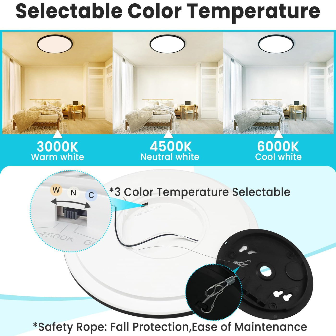 Q: Can I adjust the color temperature of this ceiling light?A: Yes, this ceiling light features a 3-in-1 color temperature option, allowing you to easily switch between warm white, neutral white, and daylight white using a toggle switch.