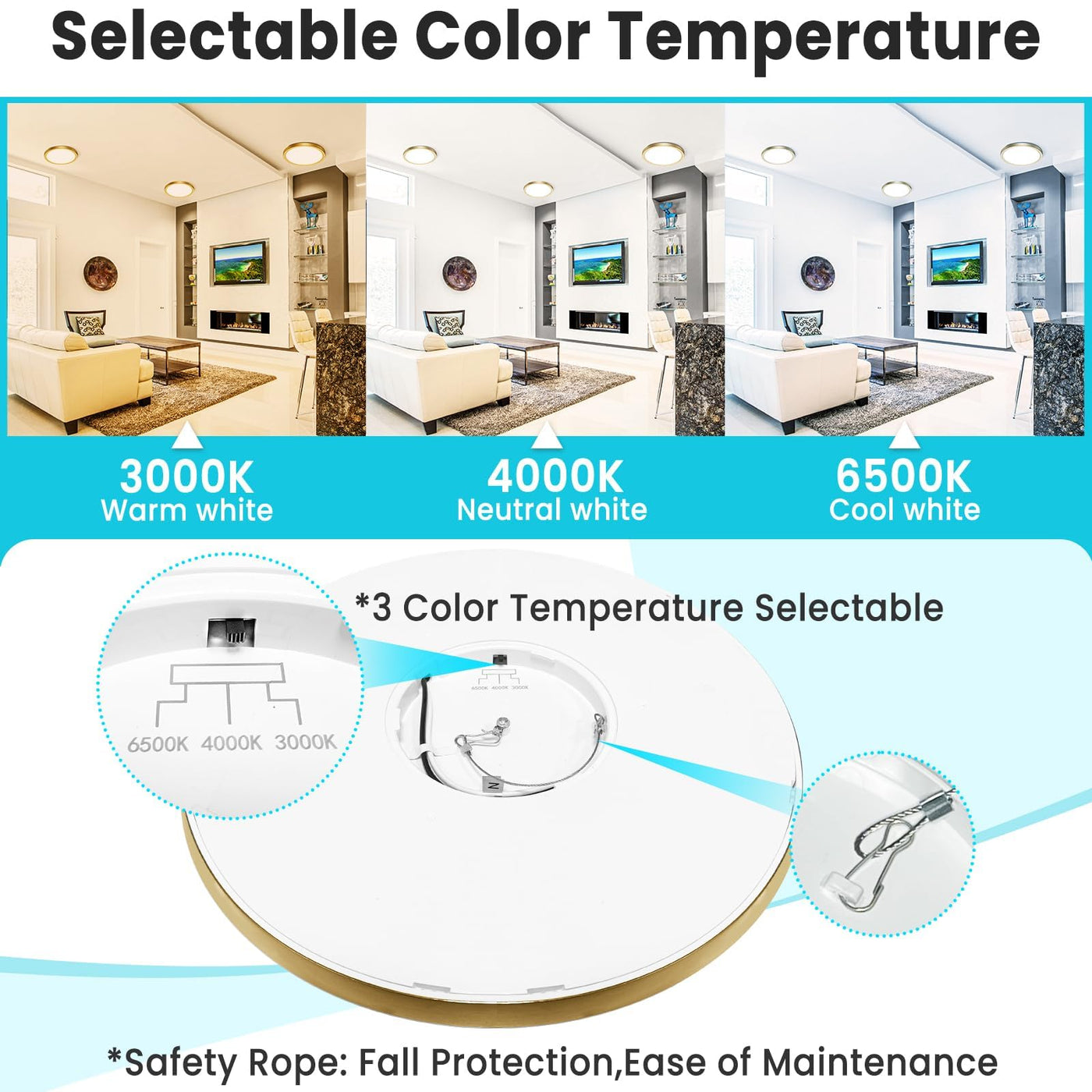 Q: What types of light temperatures does this fixture offer?A: This ceiling light offers three color temperatures: warm white at 3000K, neutral white at 4500K, and daylight white at 6000K. You can easily switch between these settings to create the desired atmosphere.
