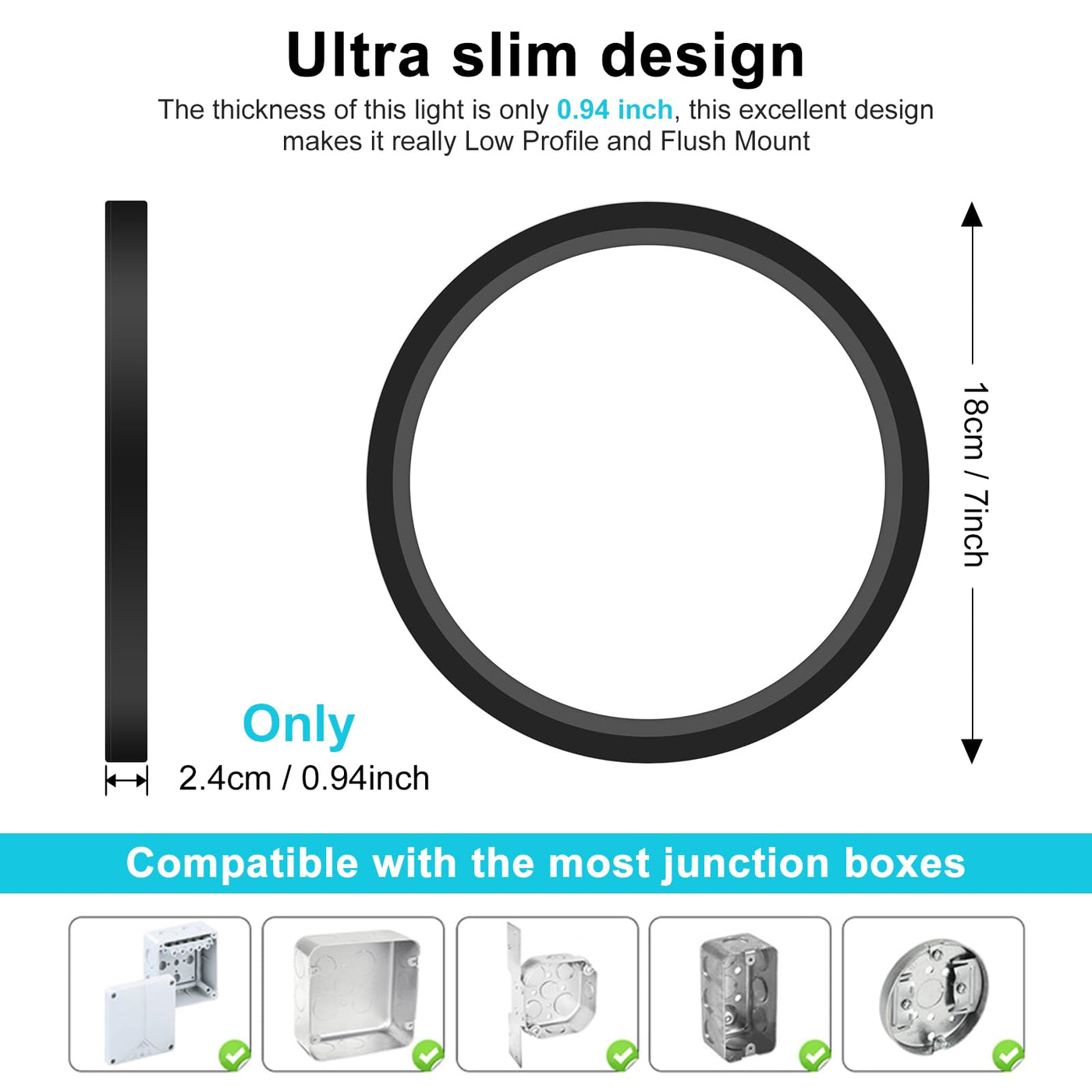 Q: What are the different color temperature options available for the libtit Black Flush Mount Ceiling Light?A: The libtit Black Flush Mount Ceiling Light offers three color temperature options: 3000K warm white, 4500K neutral white, and 6500K cool bright light, allowing you to choose the perfect illumination for any space.