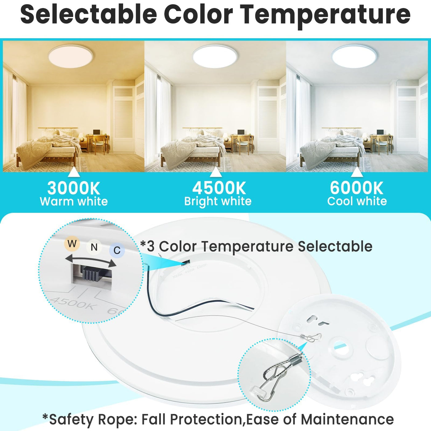 Q: How do I change the color temperature of this ceiling light?A: You can easily switch between three color temperatures—warm white (3000K), neutral white (4500K), and daylight white (6000K)—using a toggle switch on the fixture.