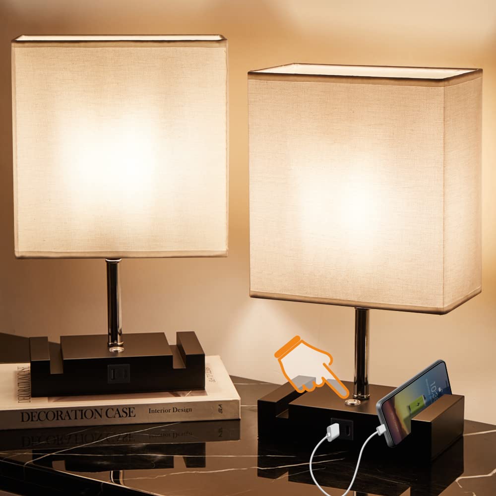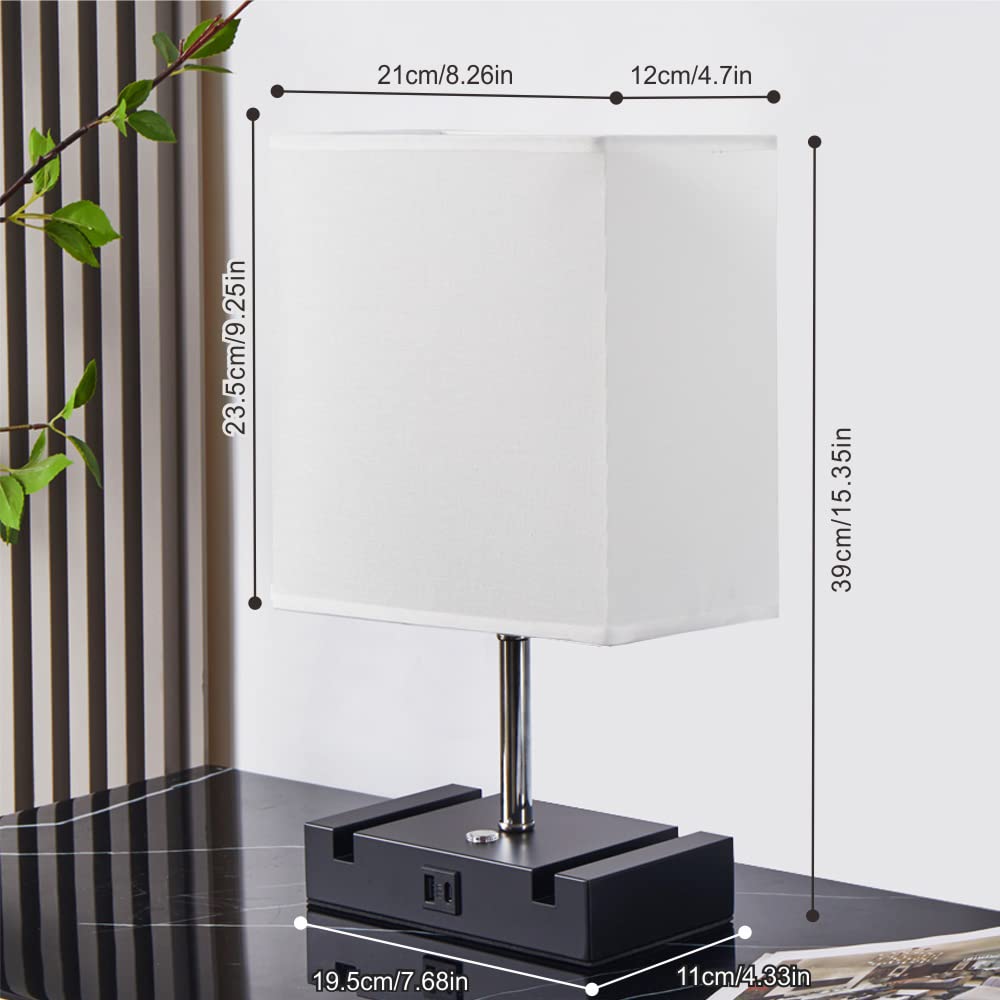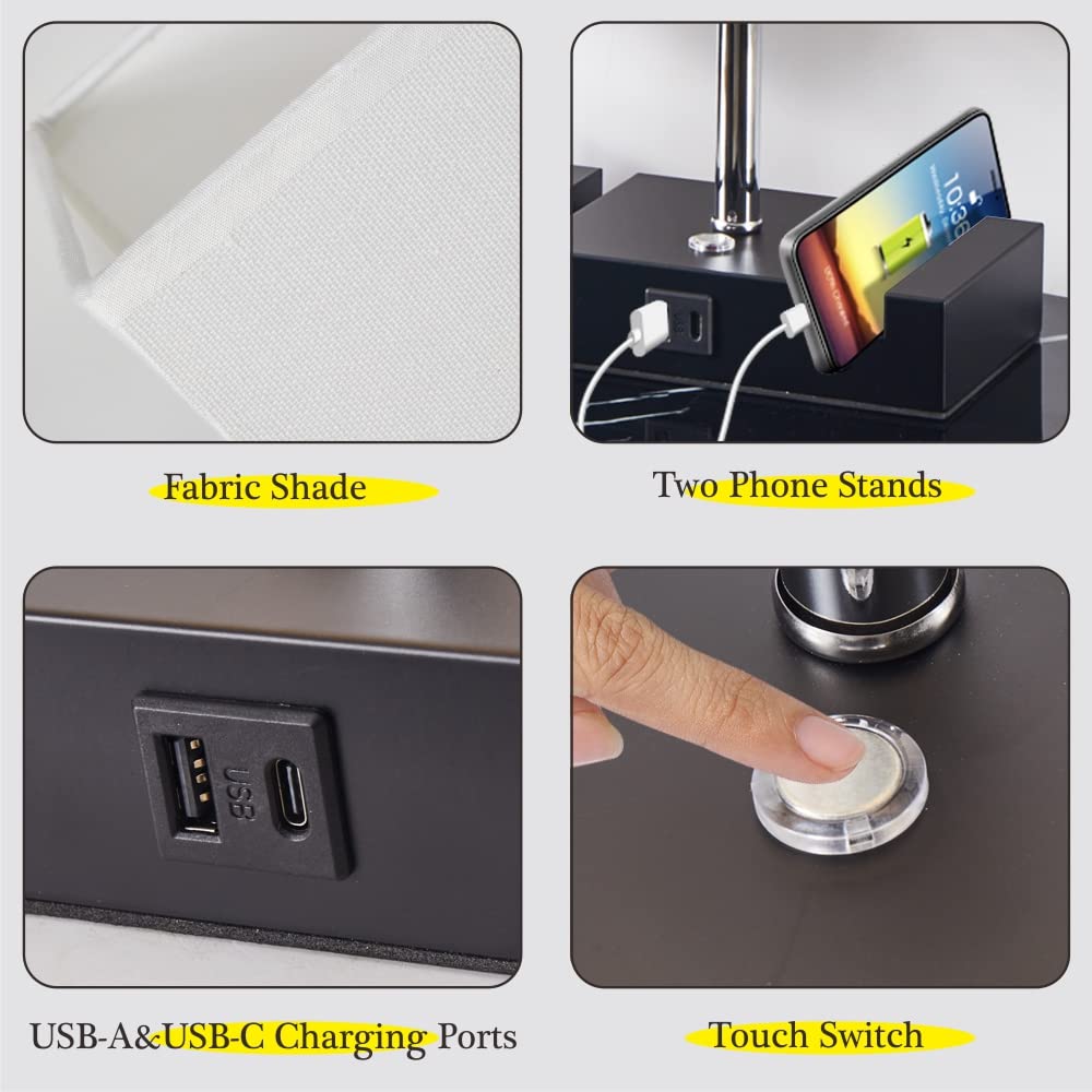 Specification Type: Table lamp aterial: Black Iron Base with White Shade Base color: Black Size(LWH): 826 x 47x 1535 inches charging Port Type: USB-A&USB-c charging Ports eature: Two Phone Stands ower Supply: Ac Powered Voltage Range: 110-130V Switch Type: Touch Switch Bulb Base: E26 Edison US universal standard bulb(Included) Wattage: 60W Bulb Max Dont use a bulb exceeding 60W and always choose high quality bulb for a better lighting Touch Design Touch Lamp blends with all types of decor It has a metal base with brushed black finish and a beautiful shade A three-way touch switch lets you choose the right level of light for your needs Eye caring: The Edison Light Bulb is designed with dimmable exposed filament giving you the freedom to create the perfect ambiance for you bedroom ,living room or office Easy to use 1When the installation completed, touch the round switch on the base, the lamp will turn on with Low Brightness 2Touch the round switch again, the lamp will change to Medium Brightness 3The third time you touch the round switch, the lamp will change to High Brightness 4 When you touch the round switch for the fourth time, the light will be off Warm Tips When installing, cleaning lamps and replacing light blubs, you must cut off power supply The size is measured by hand, so there may 1-3 cm error, please kindly note that Thanks What will you get 1*Table Lamp 1*E26 Warm White Bulb 1*User Manual