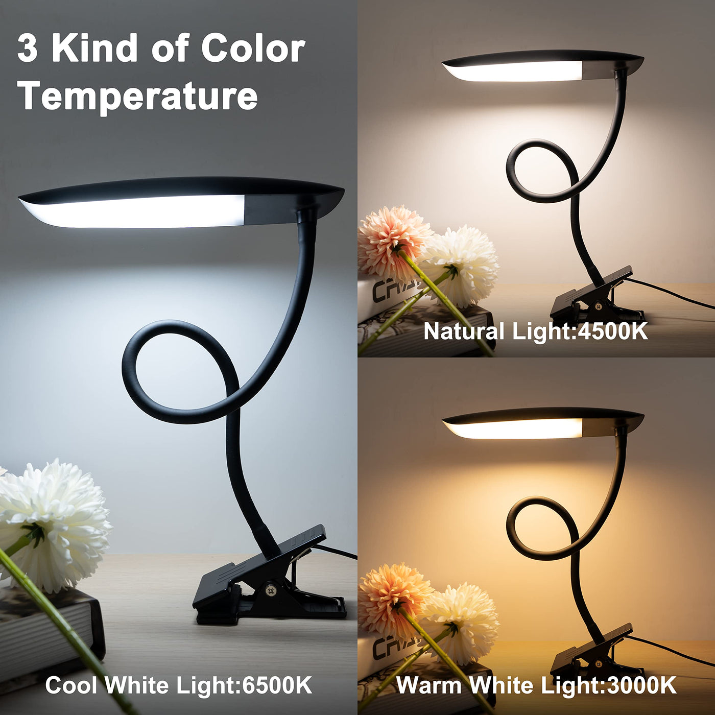 LiFMIRA Clip-On Lamp, USB Reading Light, 3 Color Modes, 10 Brightness Levels, 8W, Flexible Gooseneck, Matt Black, Eye-Caring Bed Light
