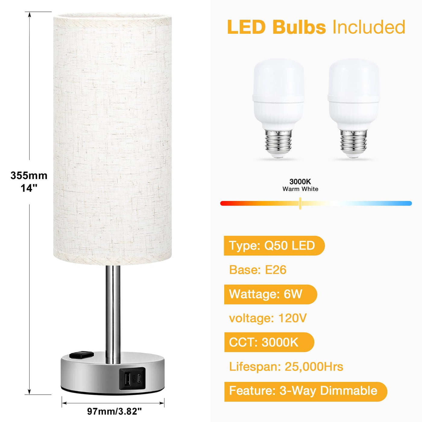 Q: What type of light bulbs are included with the lamps?A: The lamps come with two non-flicker E26 LED light bulbs, which are designed to provide consistent, flicker-free illumination, helping to reduce eye strain and fatigue, making them ideal for reading or working.