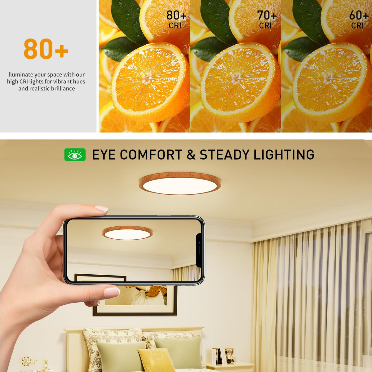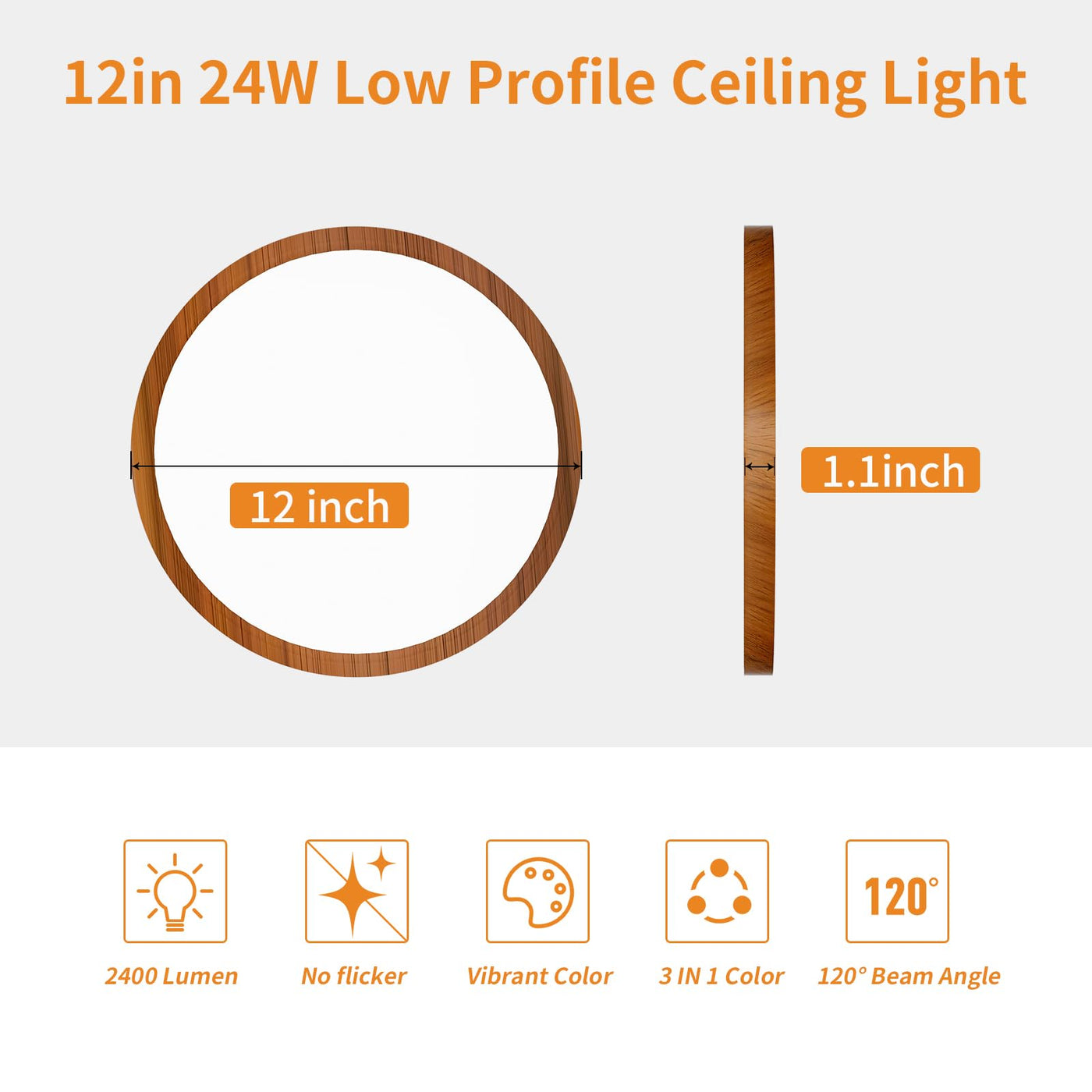 This 12-inch ultra-thin flush mount ceiling light features a walnut wood grain finish and is only 1.1 inches thick, with a simple look that blends seamlessly with a variety of decor styles.