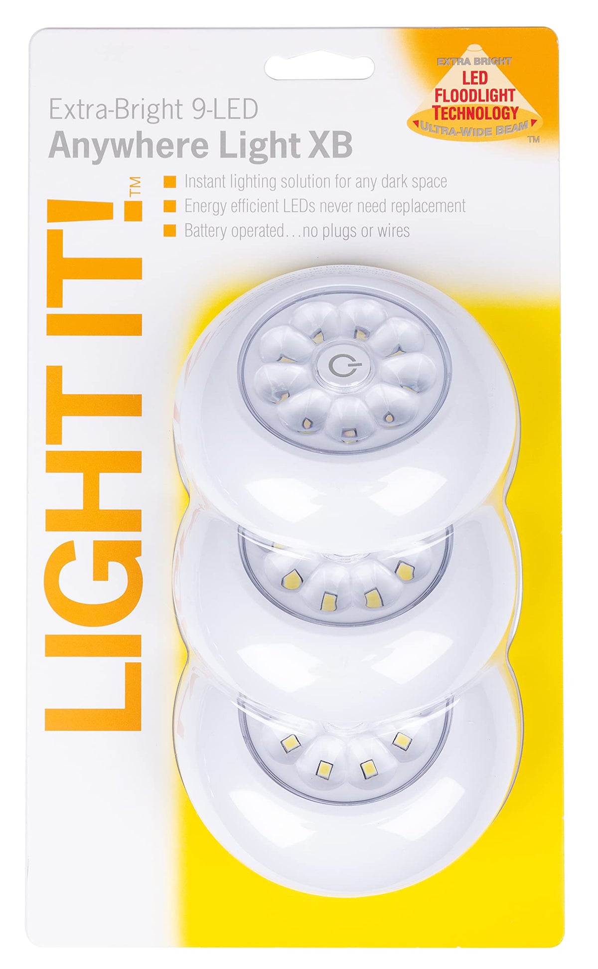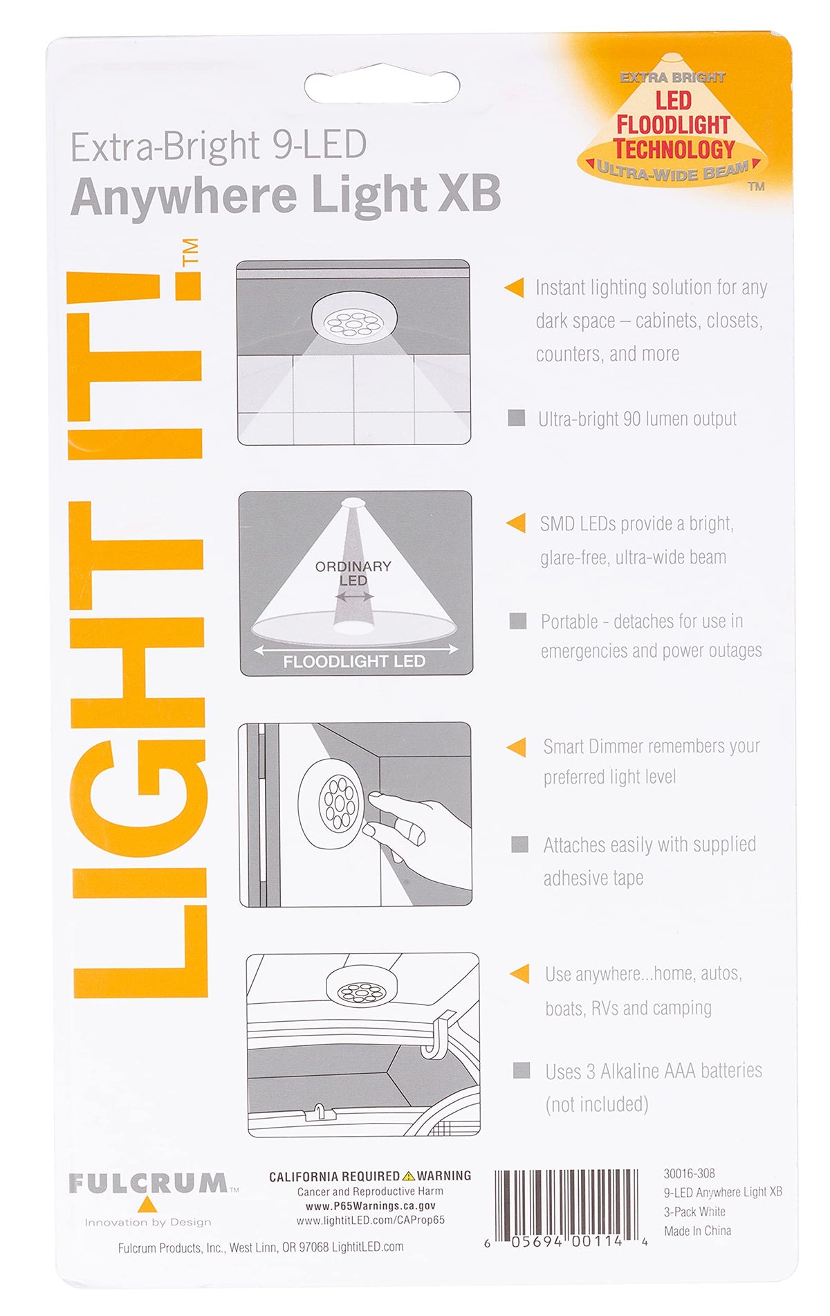 Product DescriptionThis compact light makes it easy to add extra-bright illumination to any space. It attaches to surfaces with the included adhesive strips as well as with the integral mounting bracket. Once installed, the light can be detached from the bracket for handheld use.From the ManufacturerThis 3-pack of Fulcrum LED lights will illuminate dark cupboards, closets, and corners with a simple tap. They use ultra-bright, glare-free, wide-beam LED floodlight technology. The energy efficient LED's last for 100,000 hours, never needing replacing, and the lights attach easily with the supplied adhesive tape. There are no tools required in mounting. Also, they use 3 AAA batteries (which are not included) so no hardwiring is required.