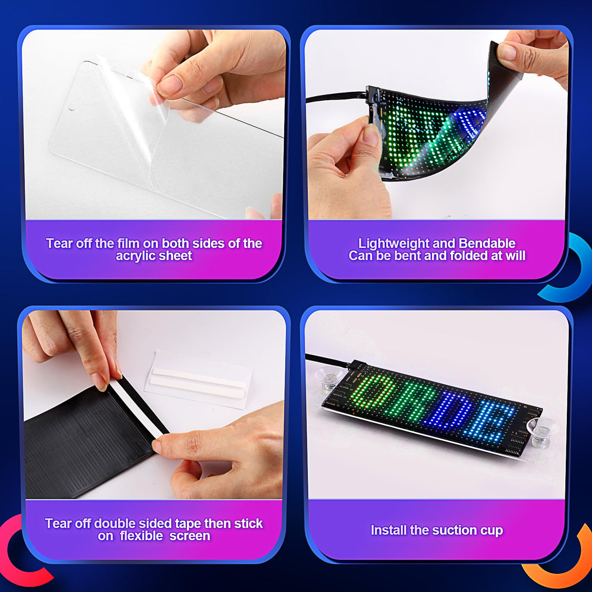 Q: Is the LED matrix panel easy to install in my car?A: Yes, the LED car sign comes with a USB interface and includes double-sided tape, an acrylic transparent board, and suction cups for effortless installation. You can easily hang it on your car windshield or other surfaces.
