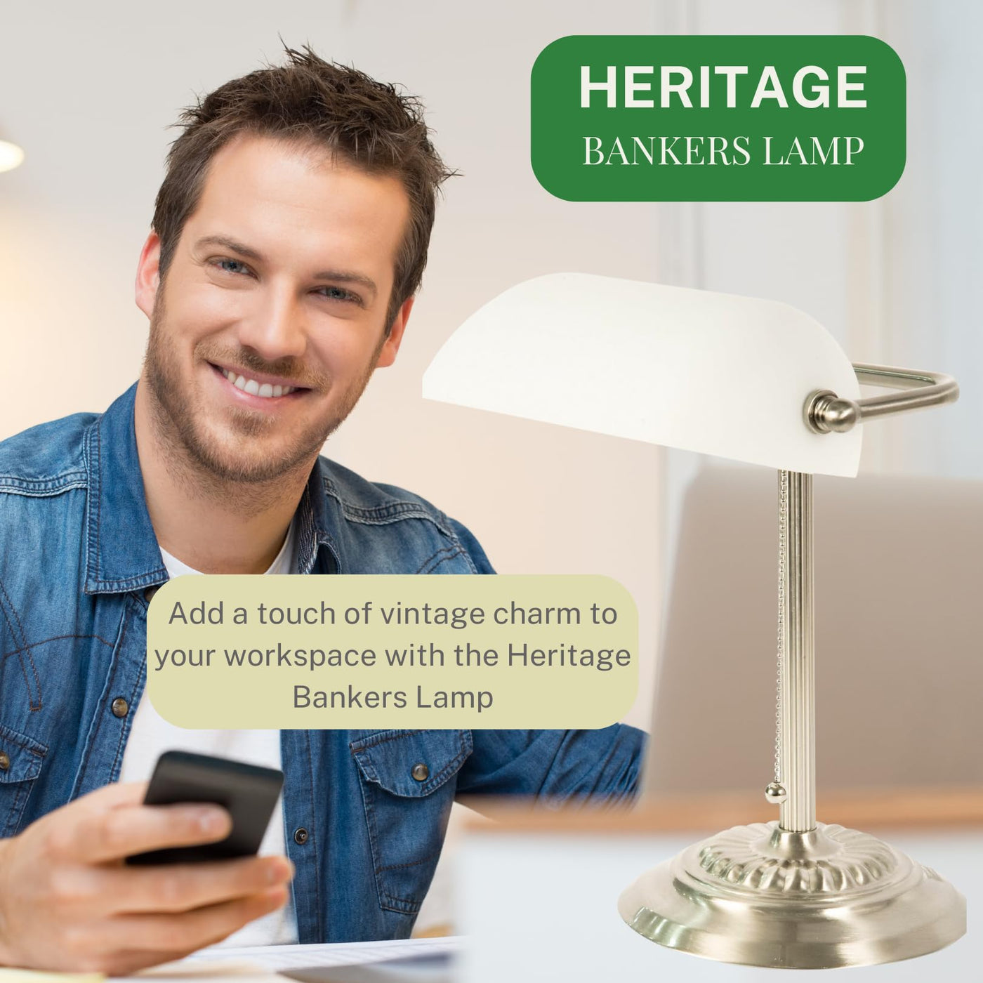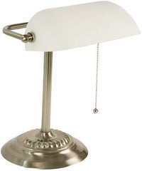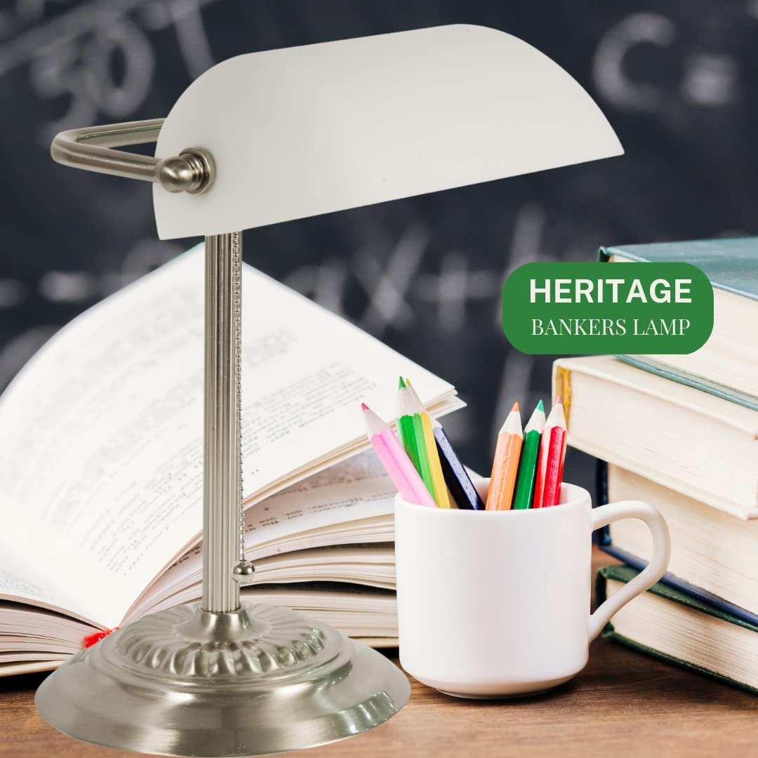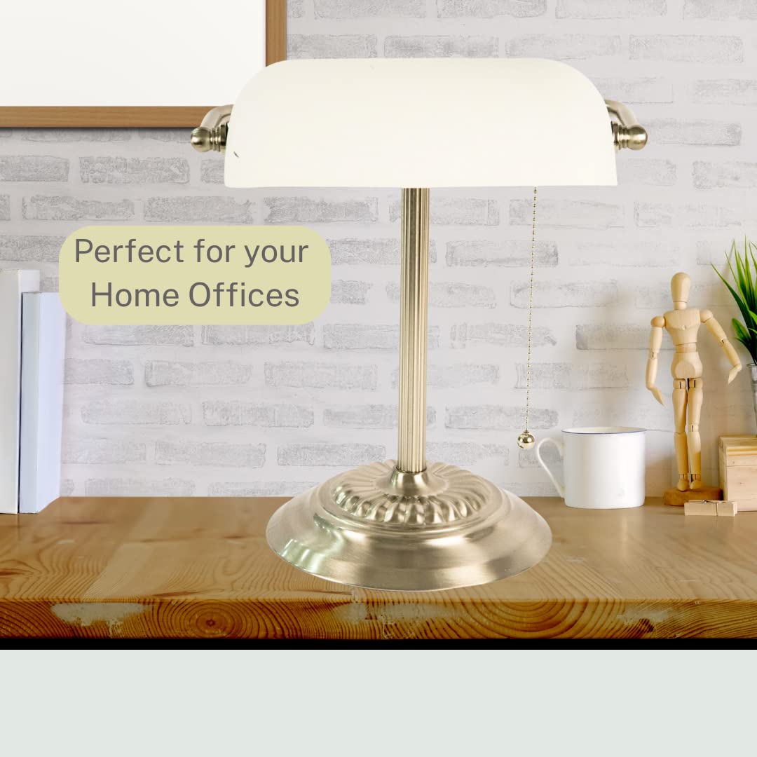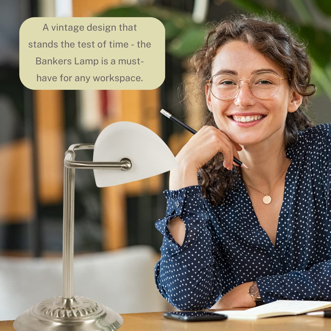 Upgrade your workspace with the LightAccents Bankers Desk Lamp. This versatile lighting solution is perfect for attorneys, accountants, musicians, and anyone looking to infuse a sense of classic style and modern functionality into their environment. Crafted with robust metal, the lamp is designed for longevity. Its polished nickel finish is an eye-catching feature, making it not only an excellent desk lamp for your office but also a stylish vintage addition to any room in your home. The adjustable white glass shade casts a soft, inviting glow, making it a prime choice for multiple tasks. It serves well as a piano lamp for late-night practice sessions or a desk lamp for home offices. The illumination it offers is gentle on your eyes, perfect for long study sessions in college dorm rooms or extended periods of number crunching in any office setting. The easy-to-use On/Off pull chain provides practical functionality, making it convenient for office desk light needs. You can even transform this classic piece into a modern LED desk lamp by pairing it with an LED bulb. Sized at 15'' H x 10.25'' W x 6.4'' D, the lamp offers adaptability and versatility. Its dimensions make it suitable as a nightstand lamp in bedrooms, a green desk lamp alternative for eco-friendly users, or a reading table lamp in any study area. This LightAccents product is more than just a lighting fixture; its a statement of timeless beauty and practical functionality. With its multi-utility, it can function as a retro desk lamp for vintage enthusiasts or as a desk lamp vintage, bringing a piece of the past to your modern life. In essence, this Bankers Desk Lamp serves as a perfect embodiment of elegance and functionality. Use it to enhance the visual appeal and practicality of any space-be it a home office, a college dorm, or a professional workspace-and experience a blend of the old-world charm and contemporary utility.