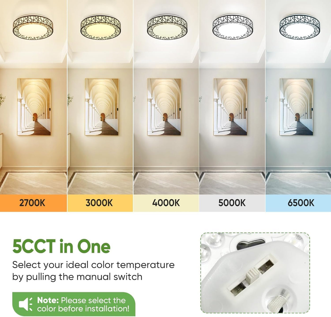 Q: What color temperatures does the Lightania flush mount ceiling light offer?A: The Lightania flush mount ceiling light offers five color temperature options: 2700K, 3000K, 4000K, 5000K, and 6500K. This allows you to choose warm light for relaxation or cooler light for work, making it versatile for various settings.